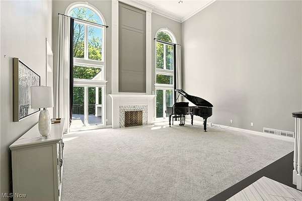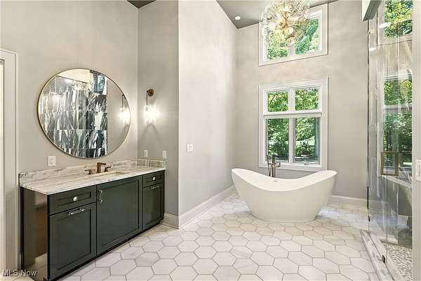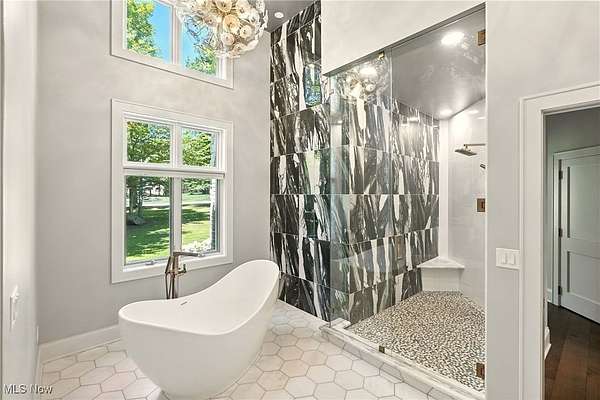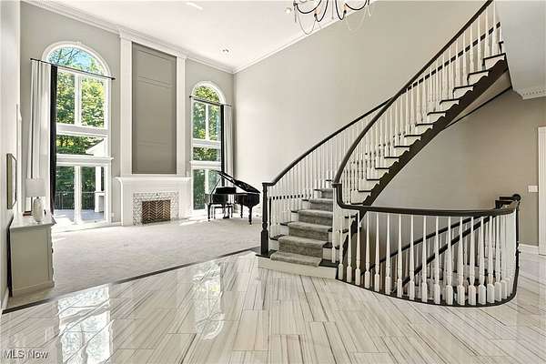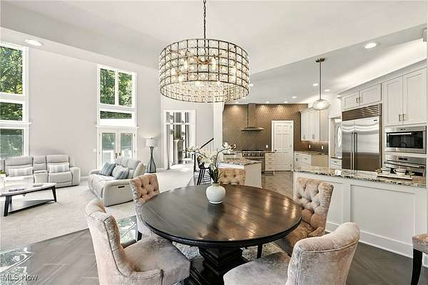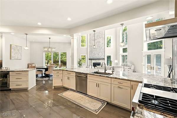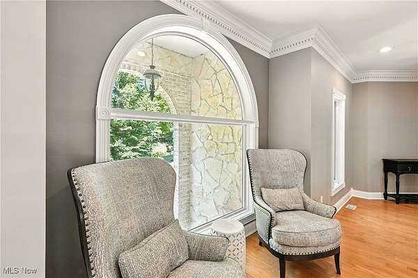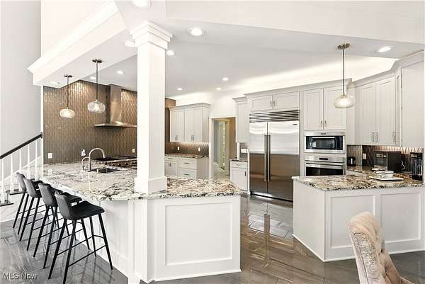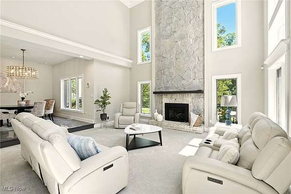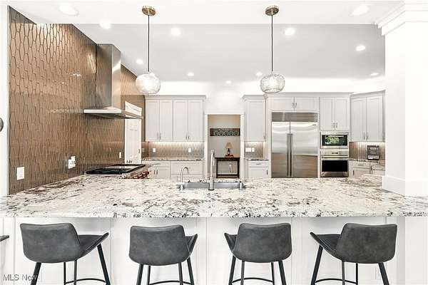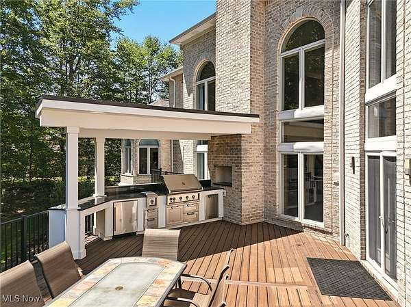 Welcome to this exceptional Colonial nestled on a private, wooded 3.47-acre lot in Richfield's Rainbow Acres. A testament to craftsmanship, this 5BD 6BA home offers a blend of classical grandeur & modern refinement. Entering the grand 2-story foyer, one is struck by the sweeping staircase and exquisite flooring. The formal dining rm exudes elegance w/dental crown molding & soaring 12ft ceiling. The 2-story sunken living rm commands attention with its stately gas FP framed by graceful arched windows. At the heart of the home lies the fully reimagined, state-of-the-art kitchen featuring granite countertops, custom cabinetry, glass backsplash & breakfast bar. Premium SS appliances include a Wolf gas range w/griddle, separate convection oven, Asko dishwasher, oversized SubZero refrigerator, beverage cooler & microwave. Thoughtful additions such as a reverse osmosis water system, under-and-above cabinet lighting, walk-in pantry, and a sunny breakfast nook elevate this culinary space. The adjoining Great room has floor-to-ceiling brick & stone gas fireplace, cove lighting, wall of glass & French doors to a sweeping deck. The magnificent FF owner's suite is a private retreat, w/tranquil sitting room & access to the balcony deck, and walk-in closet w/LED-lit custom shelving. The marble-clad ensuite bath exudes luxury. A FF study w/tray ceiling and abundant natural light provides an ideal setting for quiet work. A guest bath and a laundry/mudroom with service entrance complete the main level. The upper level boasts three generously sized en-suite bedrooms & bonus room with adjoining living space. The finished walk-out lower level features a fireside family room, full kitchen, exercise room, game and recreation areas & guest suite with fireplace. Outdoors is an impressive 40x40 outbuilding, new decking, a fully equipped outdoor kitchen w/Heston grill, hot tub, fire pit, and a waterfall feature. This remarkable home offers privacy, prestige and peaceful wooded views.