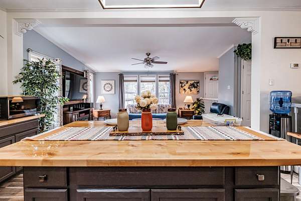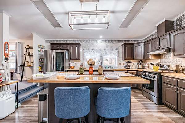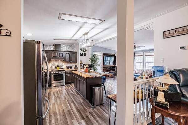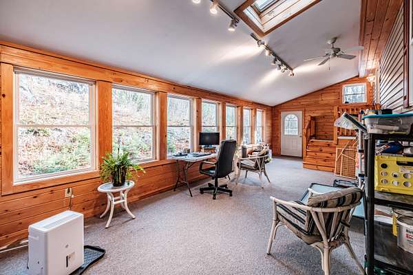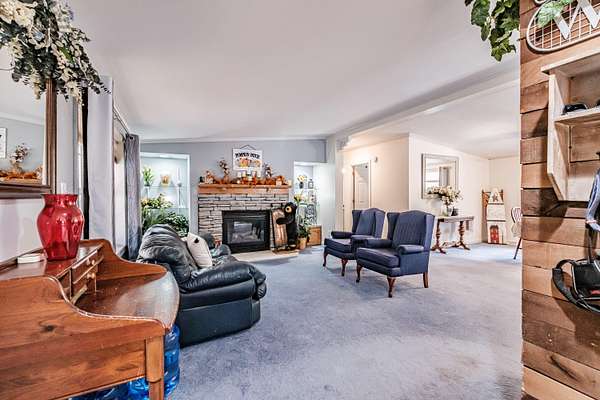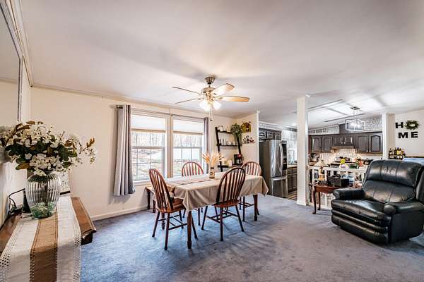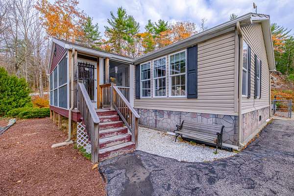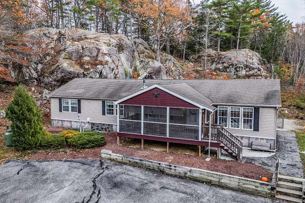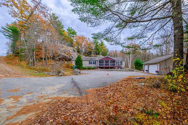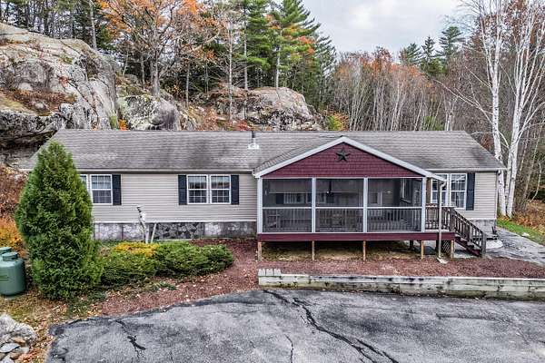 Welcome to 304 Dunn Road, a custom-built manufactured home by Champion Homes. The spacious living areas are ideal for gatherings and entertaining, whether indoors or outdoors. Enjoy the screened-in cedar porch or relax on the back patio, while being overlooked by the largest Ice Age boulder in Oxford County. The home features a large eat-in kitchen with a butcher block island. It includes three bedrooms and two full bathrooms, with the primary suite offering a generous bathroom that features a stand-up shower and soaking tub. There is a formal laundry room and a four-season addition currently used as an office. The oversized two-car garage includes a generator hookup and additional storage above. Situated on five acres of rocky terrain and ridges, the property is home to abundant wildlife.