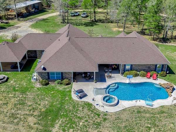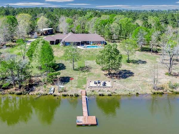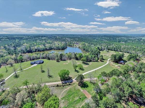 Truly extraordinary East Texas estate where luxury meets wide-open space. Situated on over 100 acres, this stunning 5,000 sq/ft custom built home offers the perfect balance of privacy and luxury living. The centerpiece of property is a breathtaking 13-acre stocked private lake, complete with a fishing pier. Step outside to your back porch resort style oasis swimming pool designed for entertaining. Inside, the home showcases expansive living areas, several dining options and abundant natural light. The oversized primary suite is a true retreat offering a spacious relaxing atmosphere. Working from home will be a breeze in the dedicated office overlooking the stunning "million dollar view". All guests rooms are spacious with ample closet space. The massive bonus/game room adds versatility -ideal for entertaining, media space, or a playroom. This one of a kind property offers the ultimate blend of seclusion, recreation and refined living - rarely down an opportunity like this come along.
