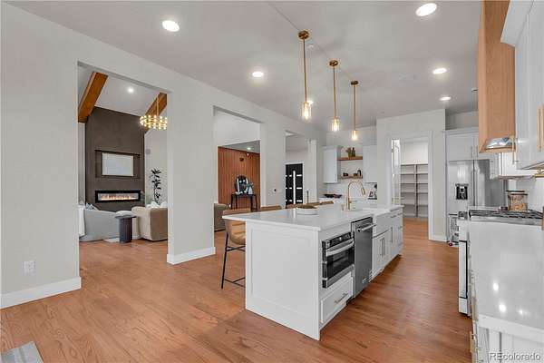The chef’s kitchen is designed for both style and function, featuring a 12-ft quartz island, premium KitchenAid appliances, 6-burner gas range with double oven, ceramic farmhouse sink, and walk-in pantry. The primary suite is a true retreat with vaulted ceilings, a spa-inspired five-piece bath, oversized shower, quartz vanity, and elegant gold fixtures. A secondary main-level bedroom boasts dual walk-in closets and its own oversized shower.