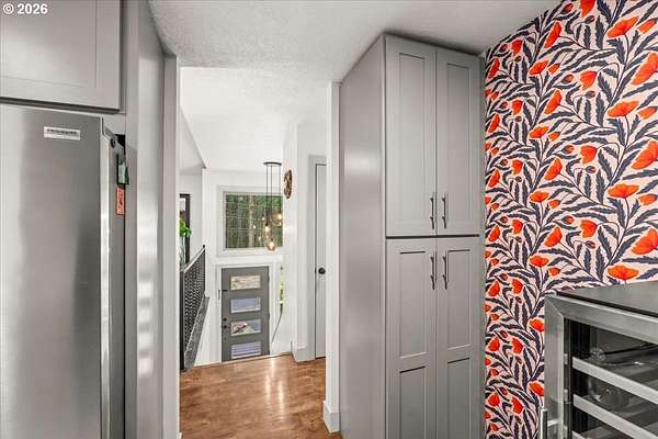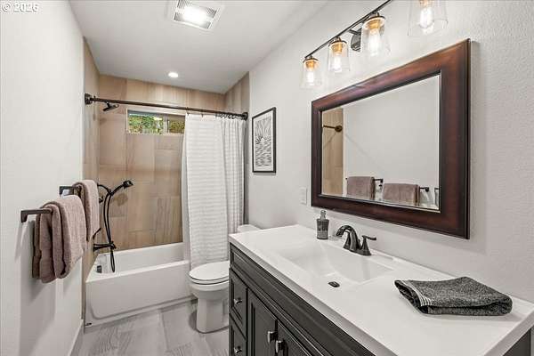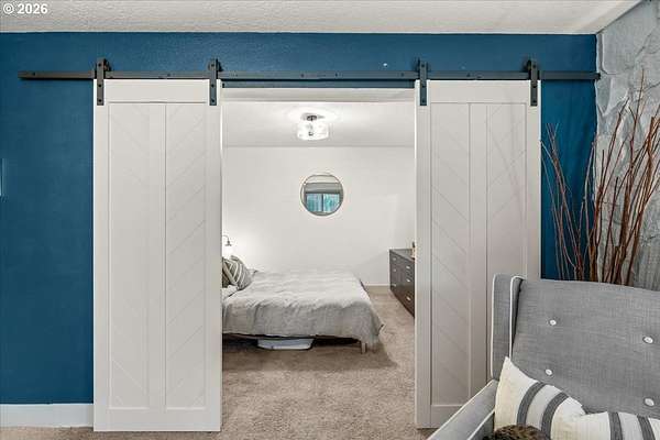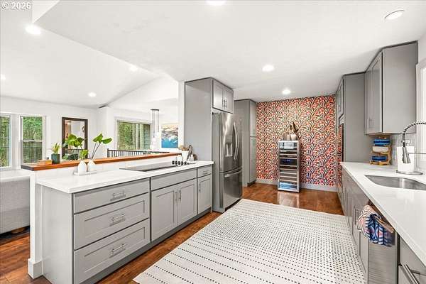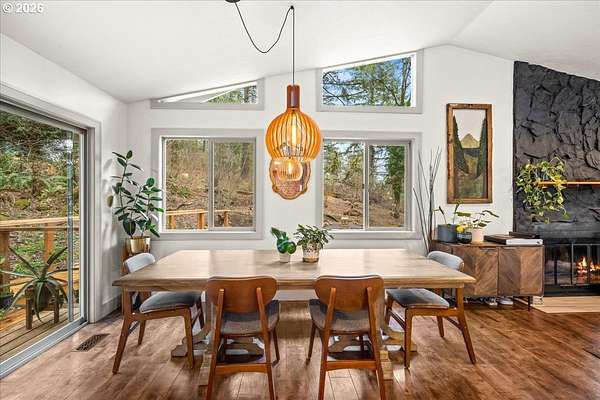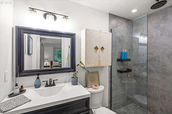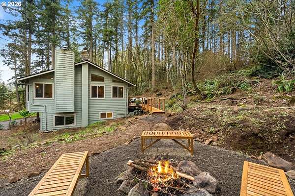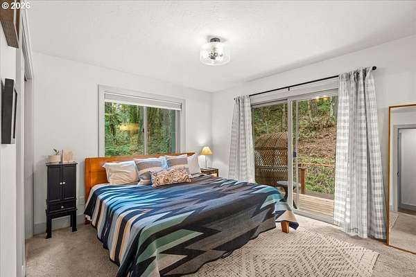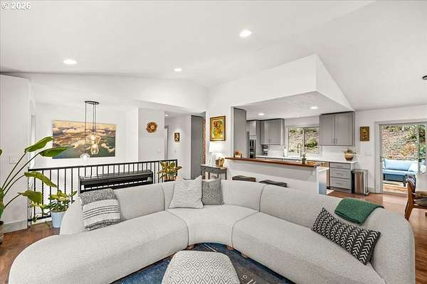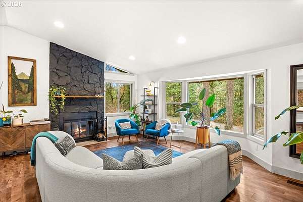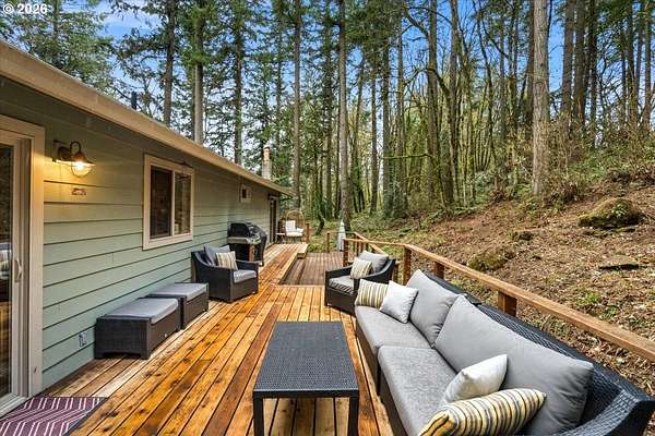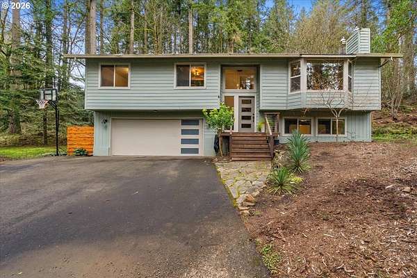 Situated in a quiet neighborhood of West Linn, this remodeled home offers privacy, nature, and modern updates all on almost 2 acres of land. Enter the home to a great room with high ceilings, an open living, dining space and beautiful kitchen with quartz counters and stainless steel appliances. The sliding doors off the dining room go out to a large deck overlooking peaceful wooded views. Large windows fill the home with natural light and bring the outdoors in. With 3 bedrooms and 2 full bathrooms on the main, the versatile lower level offers a spacious family room and recently added 4th bedroom/ den with a full bath and laundry nearby. Recent updates over the last few years include stainless steel appliances, vinyl windows, tile bathrooms, updated interior doors and trim, fresh paint and well maintained systems. Most recently a new fireplace mantle was added, a large picture window in the entry, designer colors and wallpaper, an EV charger outlet, plus landscaping like native grasses, blueberry and olive trees planted. Outside you'll find a circular driveway, special outdoor spaces like a fire pit spot, large deck, RV/boat parking, and a large space cleared for a potential ADU, studio or a fenced animal yard. All of this, just a few minutes to Hebb Park with a Willamette River boat ramp, award winning vineyards, Shortland Golf Club, and the equestrian center. Not too far from the shops and restaurants on the historic Willamette main street but far enough away to enjoy complete privacy and charming mix of neighbors-from fresh egg stands down the street to multi-million-dollar estates around the corner. A truly peaceful retreat with room to grow. See full list of features.