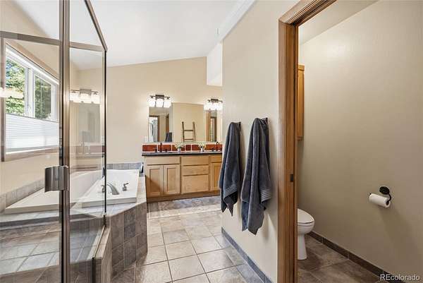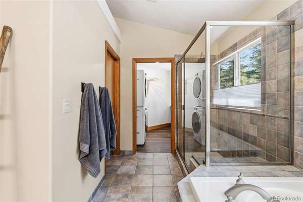 Designed for effortless main-floor living, the primary suite is a true retreat, complete with vaulted tongue and groove ceilings, a spa-inspired bathroom, deep soaking tub, and the added convenience of en-suite laundry. From the primary, you'll also enjoy easy access to the deck and covered seating area.