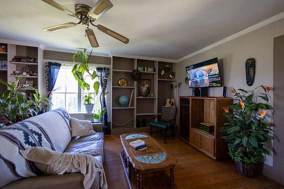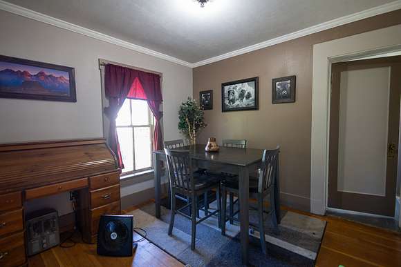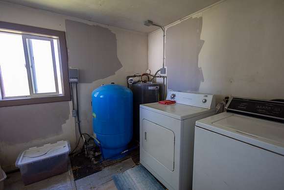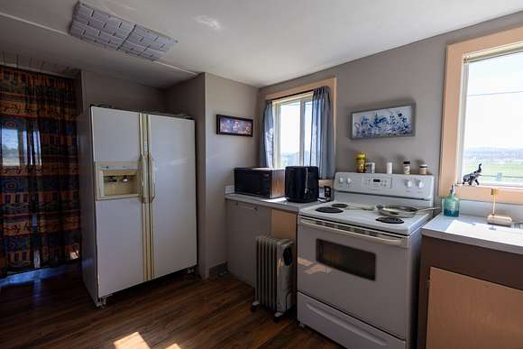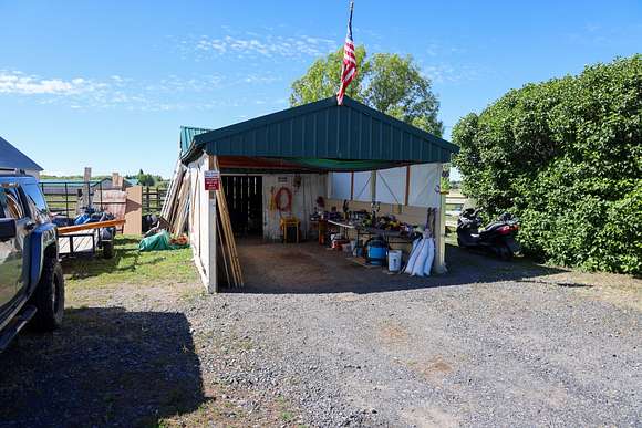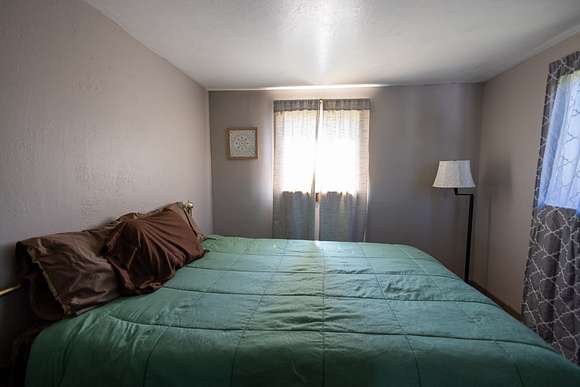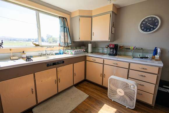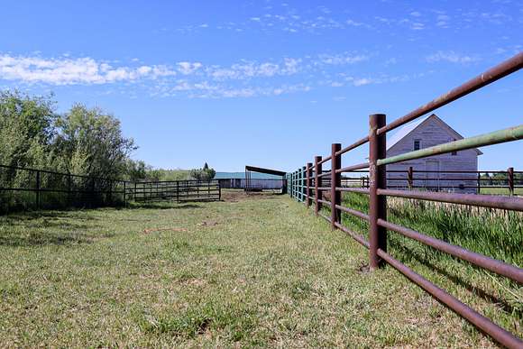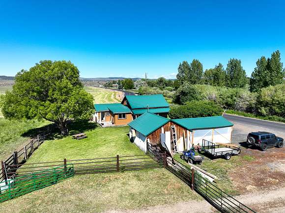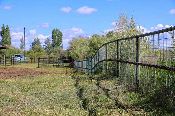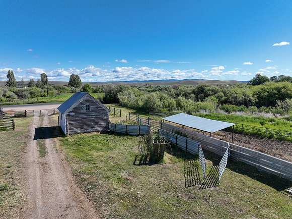 The original homestead residence spans 1,188 square feet, featuring two comfortable bedrooms and a full bathroom. The home's inviting interior boasts wood flooring through the family and dining areas, complemented by a ceiling fan that adds to the welcoming atmosphere. The galley-style kitchen is thoughtfully arranged to maximize space, situated near the bathroom, laundry, and utility rooms. Upstairs, additional storage space offers practicality without sacrificing the home's cozy feel. Outside, mature trees and graceful willows create a private oasis surrounding the home, while a detached carport and adjoining outbuilding provide ample storage close at hand. The property's working corrals, livestock sheds, and barn are conveniently located nearby, including a covered corral area complete with an alley and squeeze chute, making this farm fully operational and ready for immediate use.