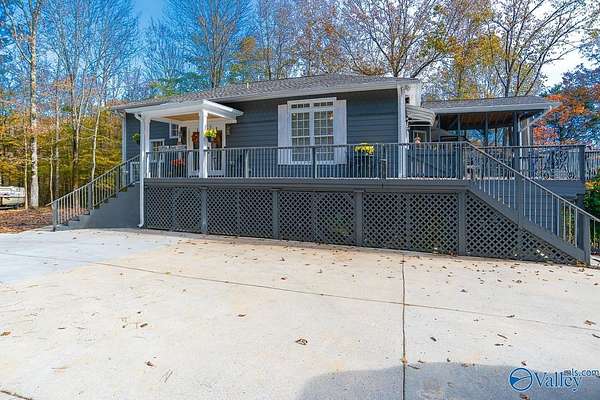Only 20 minutes from Huntsville. Want a secluded place in the woods by a lake with lake access? Custom built main house geared for entertaining and family living with 10 foot ceilings on the main level, and 9 1/2 on lower level. 3 bedroom, 3 1/2 bathroom, (two with walk-in showers), along with large gathering spaces. Inside: New Granite countertops in the kitchen, freshly painted interior, new 80 gallon hybrid water heater. 300 amp service. Primary suite on lower lever includes an office/art studio. Outside: Enjoy a screened porch, deck, pizza oven and gazebo in a quiet setting. Detached office or apartment, connected by a catwalk. Separate storage building perfect for UTV's.