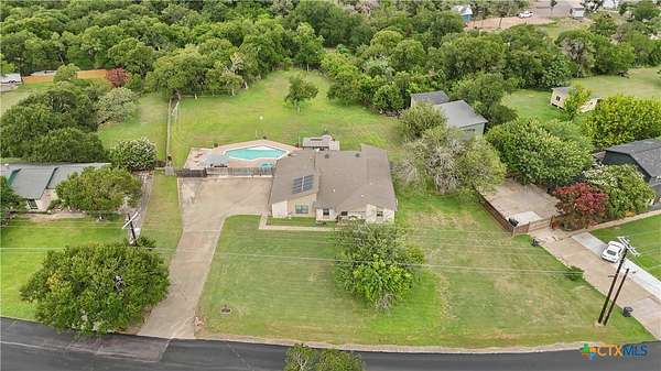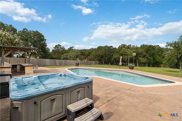 A rare opportunity to own 1.3 acres with a fully fenced backyard, no back neighbors and a private backyard oasis complete with an in-ground pool, hot tub, and a full outdoor kitchen. Designed for both relaxation and entertaining, the outdoor space features a built-in grill, side burners, deep sink, counter seating, and room for a mini fridge, all under a covered patio and a cabana with lighting. There's also a dog run at the back of the property, a storage shed, and gated access for parking your RV or boat in the spacious backyard. Inside, this one-story home offers a flexible layout with 4 bedrooms, 3 full bathrooms, and 2 separate living areas. The galley-style kitchen includes a large island and abundant cabinet space, while the dedicated dining room is ideal for gatherings. The primary suite is oversized and features dual walk-in closets, a soaking tub, double vanity, and an upgraded shower head. One of the secondary bedrooms includes a private ensuite, perfect for guests or multigenerational living. The cozy main living area is anchored by a wood-burning fireplace and connects seamlessly to the rest of the home. Additional features include a workshop/flex space off the two-car garage, fully paid solar panels, a new water heater, new blinds, new gutters, and upgraded fixtures and hardware throughout. Located just minutes from Johnson High School and downtown Buda, with easy access to I-45 for commuting into Austin, this property combines the comfort of a well-maintained home with the luxury of expansive land and outdoor amenities. Don't miss your chance to own one of the most unique and feature-packed properties in the area.