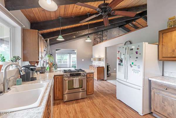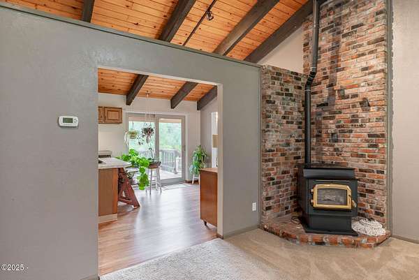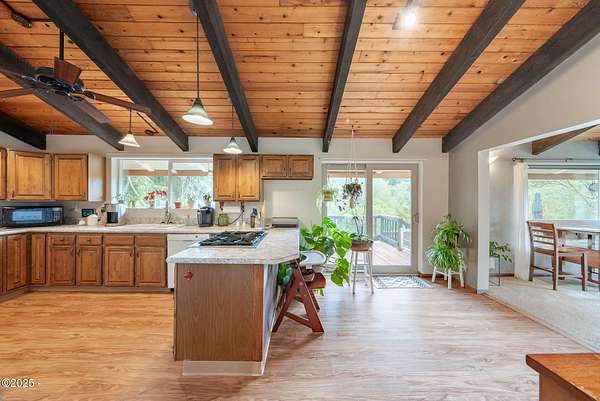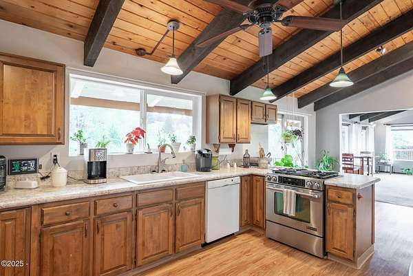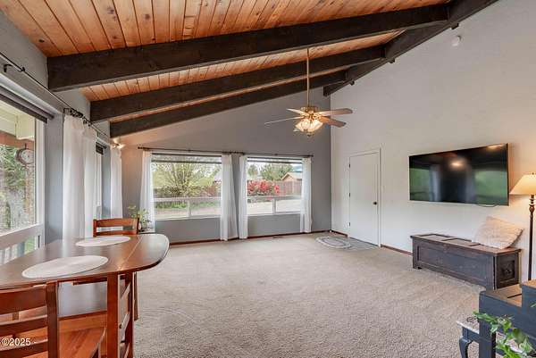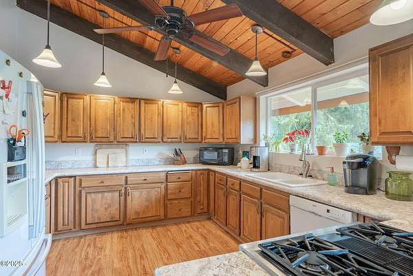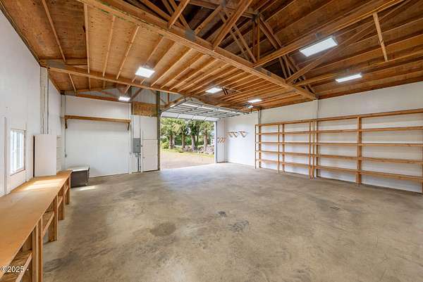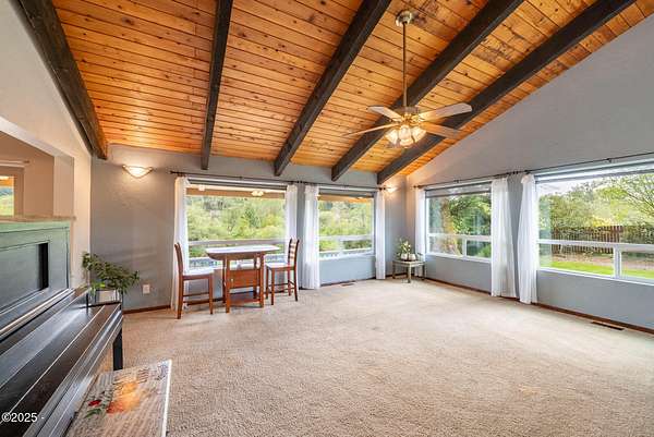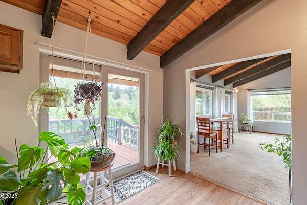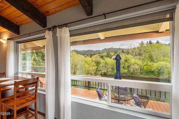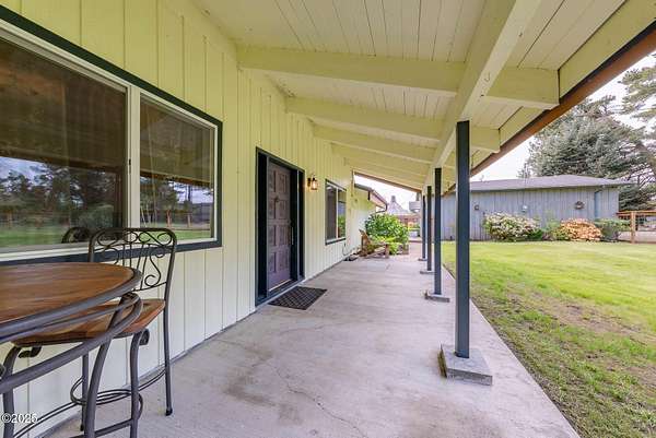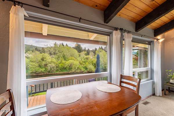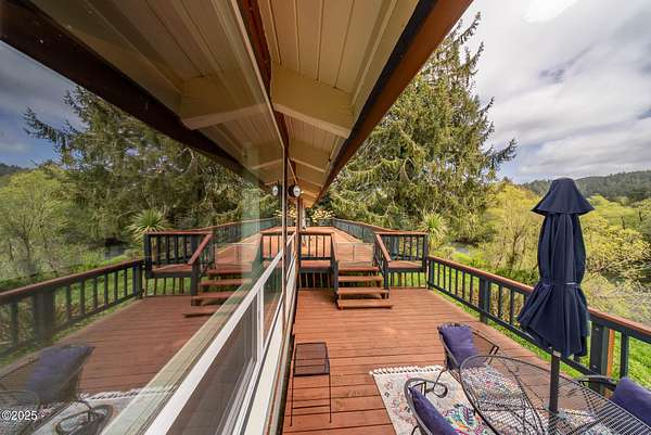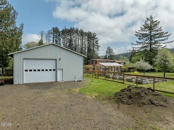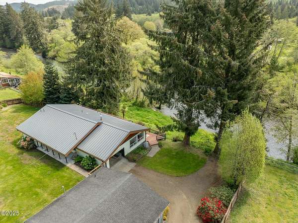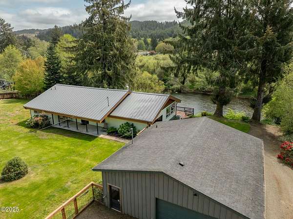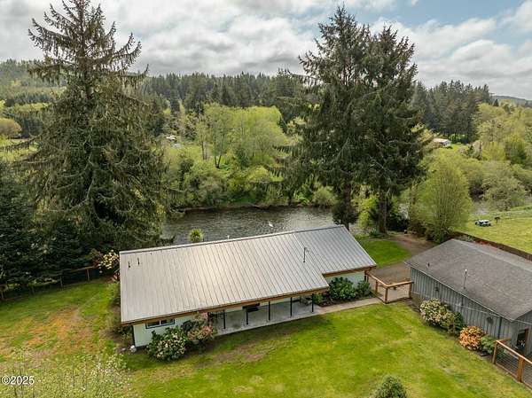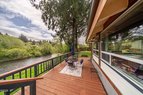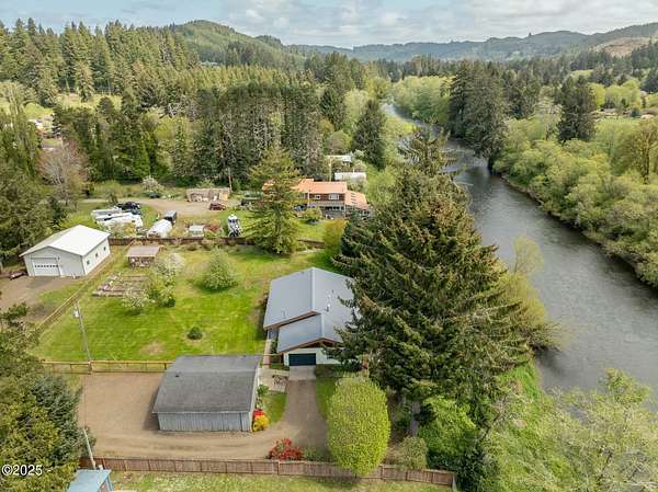 Scenic River Front 1.5 Acre with Spacious Single Level home. 4 bedroom, 2 bath, living room, separate dinning room and cathedral wooden beamed ceilings. Kitchen functionality at its best. Beautiful views of the river from the sprawling deck. Workshop with water, electricity and plenty of storage for the hobby enthusiasts. X-Large RV/Boat garage with electric, lighting and plenty of space for other large projects. Fenced yard, with apple trees, plum tree, mature blueberry bushes, raised garden beds and a green house with electricity and hot/cold running water perfect for the Gardner who enjoys a dedicated space. Property is not in a flood zone. River access for your own fishing hole. 15 minutes to the Pacific Coast. Tranquil living at its best!