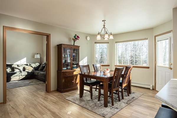 Well-cared-for, efficient home on Chena Ridge with southern exposure bringing in great natural light and stunning sunrise views. Located in a quiet, established neighborhood with a peaceful setting. Enjoy a partially paved driveway, landscaped upper lawn, and a path leading to a private picnic area. Inside features a bright living room with woodland views and a Hearthstone wood stove, plus a cozy family room off the kitchen and dining area with easy garage access. Upstairs offers a primary suite with walk-in closet and ensuite bath, two additional bedrooms, full bath, and a mezzanine overlooking the living space. Built for efficiency with low fuel use, triple-pane windows, and custom cellular blinds. Recent updates include a new leach field (2022), newer wood stove, updated countertops, partially paved driveway, and water treatment system with reverse osmosis.