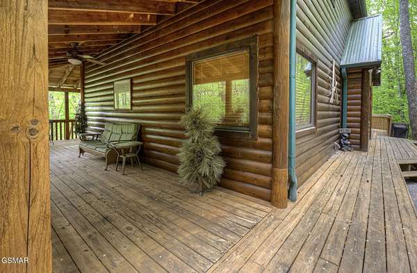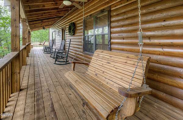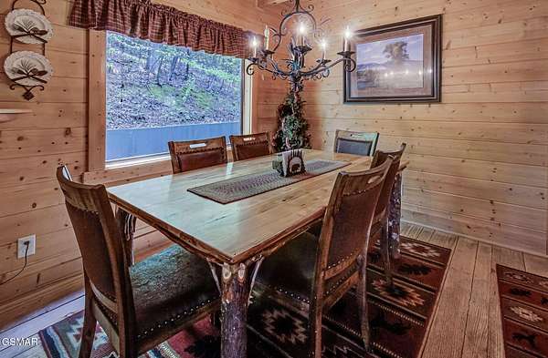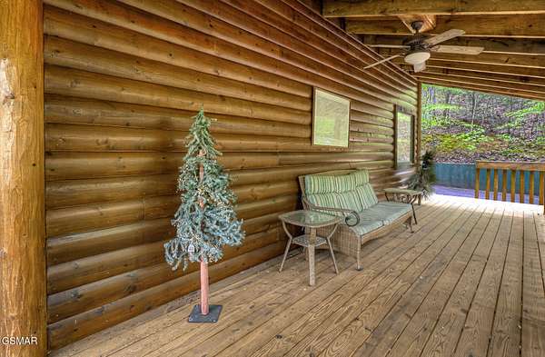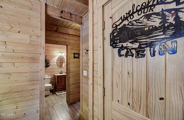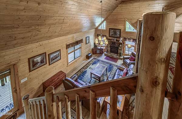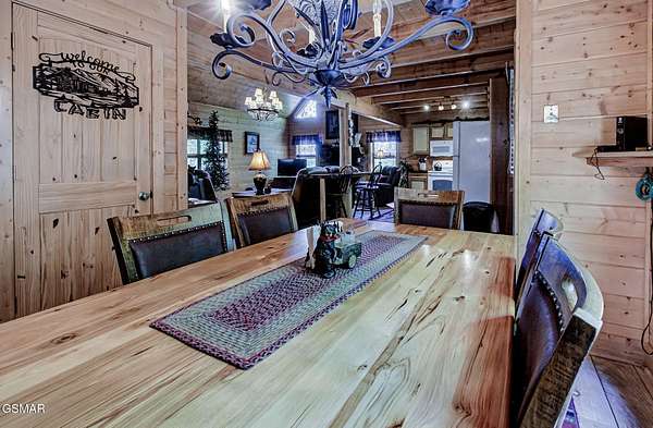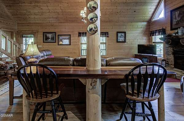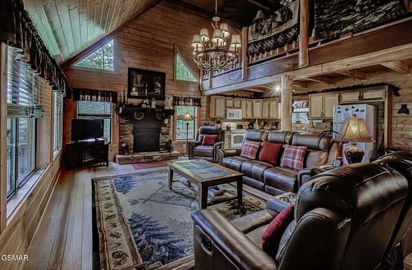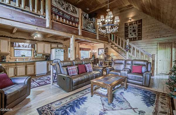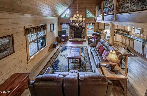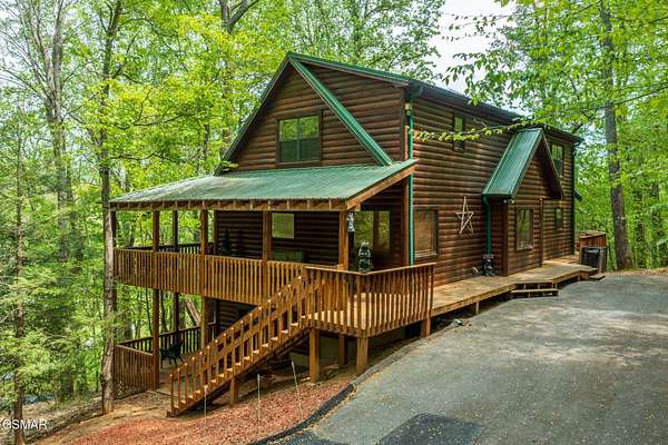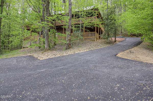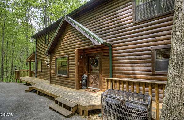 RUSTIC 2-Bedroom, 2.5-Bath CABIN on 1.92 PRIVATE ACRES located in the Foothills of the Great Smoky Mountains in beautiful WEARS VALLEY. The driveway to cabin is 500ft of gorgeous rolling meadow views. Upon arrival at the cabin take in all the beauty and serenity of being nestled in a private wooded setting. In just a few steps you will be on the 8-ft wrap-around decking to relax on and enjoy all the tranquility of nature. Cabin is fully furnished and features an inviting great room with vaulted ceiling, black walnut log mantel above the stacked-stone fireplace, and beautiful plank-style flooring. The fully equipped kitchen boasts stunning poplar cabinets, and a custom hand-crafted poplar bar for additional seating next to dining area. Primary bedroom on main level with king-size bed, spacious ensuite bath with soaker tub, walk-in shower and dual sink vanity made from red cedar. Also on the main level is a half bath and large laundry room with full-size washer/dryer. The stairs to the loft area features custom handrail, pickets/posts made from white and western cedar. The spacious loft features the rec room/sitting area and the second primary bedroom with log queen-size bed, walk-in closet, ensuite bath with tub/shower combo, and custom vanity. Cabin has a total of 1,855 finished SF on the main/upper levels, and 1,180 SF of unfinished basement area with so much potential for additional finished square footage. Basement level also features a covered wrap-around deck. Cabin currently sleeps up to 6 guests comfortably. Built in 2007 and features all-wood interior quality craftsmanship throughout. The unique features include wood that was sawmill-cut, planed and tongue & grooved by the owner/builder. The variety of woods include white & red oak flooring, and white pine walls throughout. Located only minutes from Townsend, Pigeon Forge, Gatlinburg, and the Great Smoky Mountains National Park. VRBO rating is ''Exceptional.'' Drone photography used.