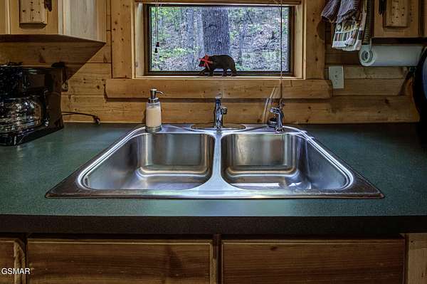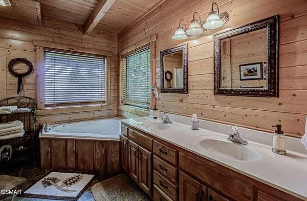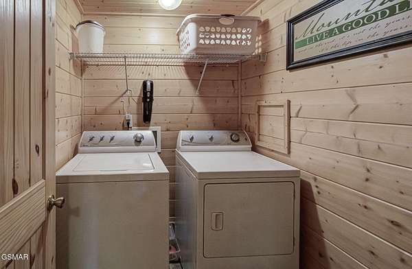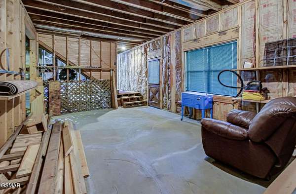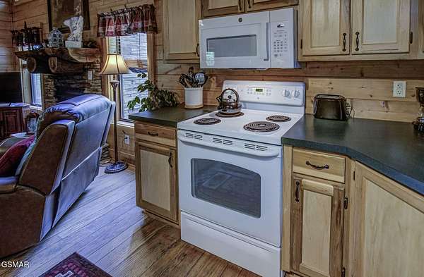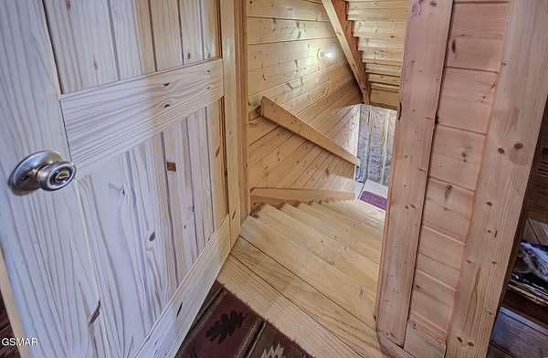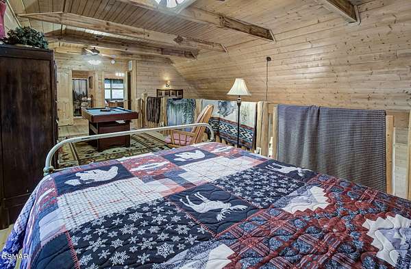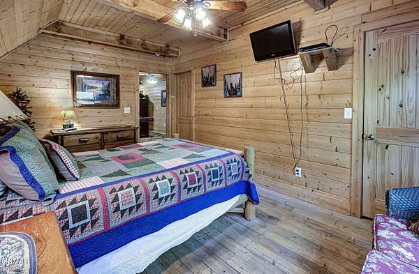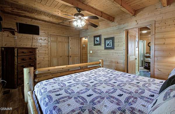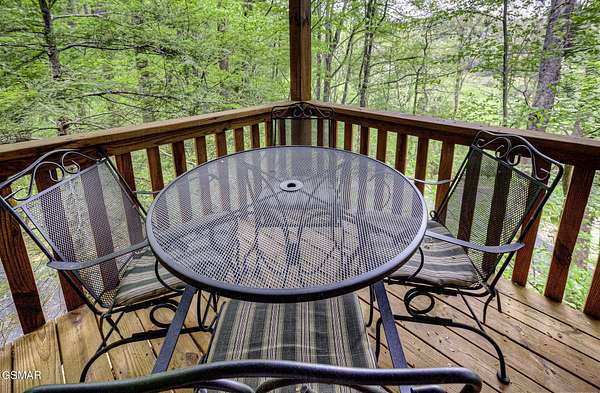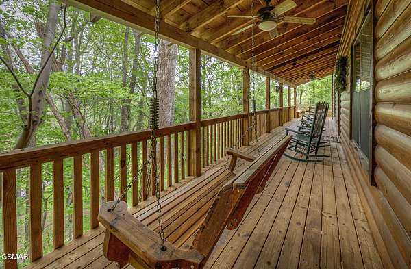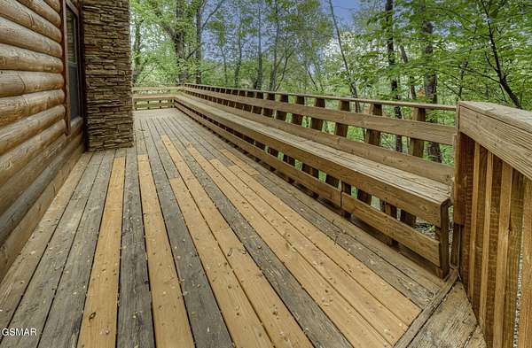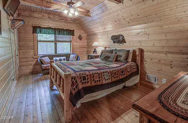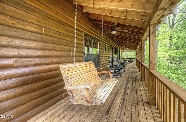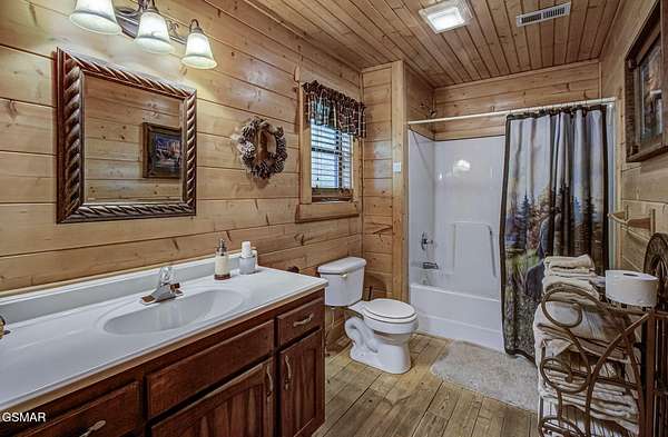 RUSTIC 2-Bedroom, 2.5-Bath CABIN on 1.92 PRIVATE ACRES located in the Foothills of the Great Smoky Mountains in beautiful WEARS VALLEY. The driveway to cabin is 500ft of gorgeous rolling meadow views. Upon arrival at the cabin take in all the beauty and serenity of being nestled in a private wooded setting. In just a few steps you will be on the 8-ft wrap-around decking to relax on and enjoy all the tranquility of nature. Cabin is fully furnished and features an inviting great room with vaulted ceiling, black walnut log mantel above the stacked-stone fireplace, and beautiful plank-style flooring. The fully equipped kitchen boasts stunning poplar cabinets, and a custom hand-crafted poplar bar for additional seating next to dining area. Primary bedroom on main level with king-size bed, spacious ensuite bath with soaker tub, walk-in shower and dual sink vanity made from red cedar. Also on the main level is a half bath and large laundry room with full-size washer/dryer. The stairs to the loft area features custom handrail, pickets/posts made from white and western cedar. The spacious loft features the rec room/sitting area and the second primary bedroom with log queen-size bed, walk-in closet, ensuite bath with tub/shower combo, and custom vanity. Cabin has a total of 1,855 finished SF on the main/upper levels, and 1,180 SF of unfinished basement area with so much potential for additional finished square footage. Basement level also features a covered wrap-around deck. Cabin currently sleeps up to 6 guests comfortably. Built in 2007 and features all-wood interior quality craftsmanship throughout. The unique features include wood that was sawmill-cut, planed and tongue & grooved by the owner/builder. The variety of woods include white & red oak flooring, and white pine walls throughout. Located only minutes from Townsend, Pigeon Forge, Gatlinburg, and the Great Smoky Mountains National Park. VRBO rating is ''Exceptional.'' Drone photography used.