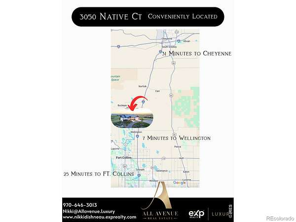 GPS is accurate. From I-25, exit onto Owl Canyon Road and head west. Turn right at the roundabout to turn North onto N. Country Road 9. Then, turn left onto Native Ct.; property is the second driveway on the right.