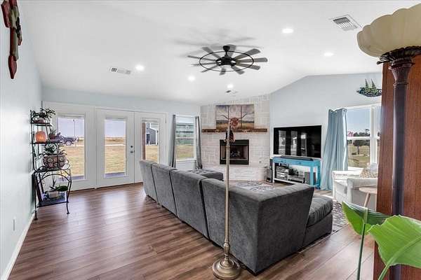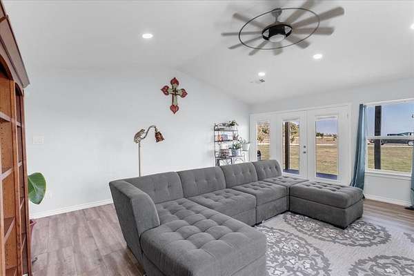 Ranch house, barndominium, working shop (including water and electric) and loafing shed all on 23.976 fenced and cross-fenced acres. Whether you're needing to get away, get off the grid or get your homestead going, this property checks all the boxes. The ranch house features cement board siding, foamed insulation throughout with wood, LVP, ceramic tile flooring and a tankless water heater. The ranch house was freshly remodeled in 2023 including a new Trane HVAC unit. Barndo is roughly 1900 square ft hosting a kitchen, two bedrooms, two full bathrooms, office or art room as well as a recreational room upstairs. Barndo has CAT 6 cable, tankless water heater and new Trane HVAC unit installed in 2021. The 1500 square ft workshop features 3 roll up doors with 2 automatic door openers and an RV hookup. Bring your animals and dreams out to this peaceful ranch. Rare find in Van Alstyne School District.