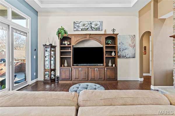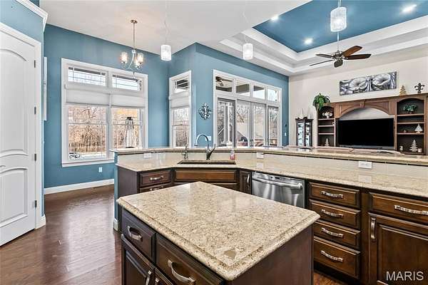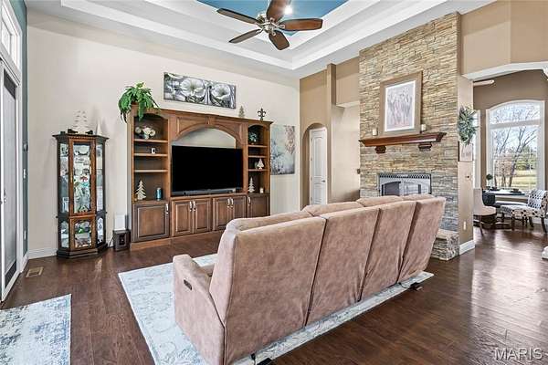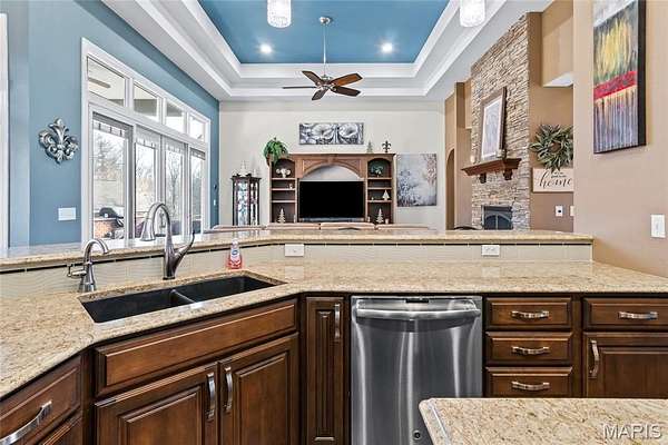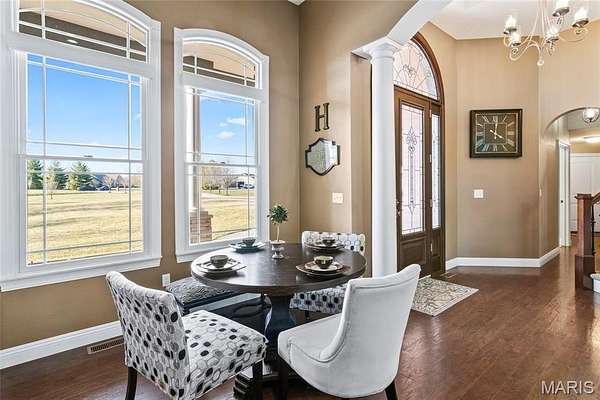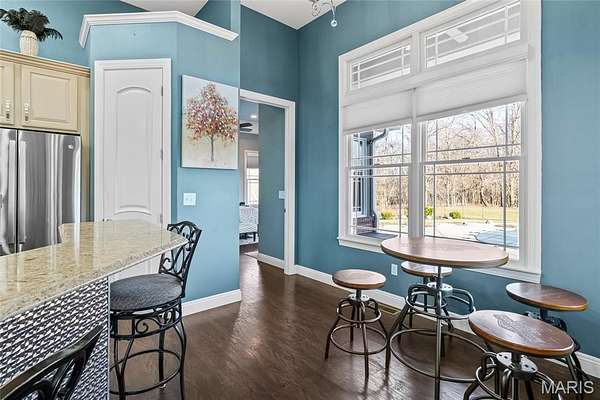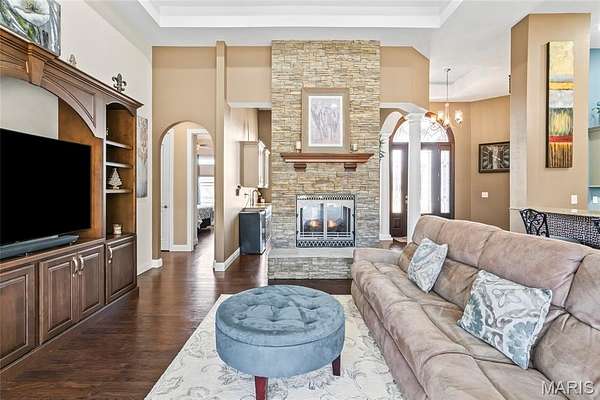 From the moment you step inside, you’re greeted by soaring 14-foot ceilings, dramatic 8-foot interior doors, and a light-filled open layout designed for both everyday living and unforgettable entertaining. The show-stopping great room features a striking double-sided gas fireplace, creating warmth and ambiance that flows seamlessly through the main living spaces.