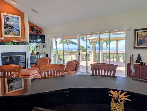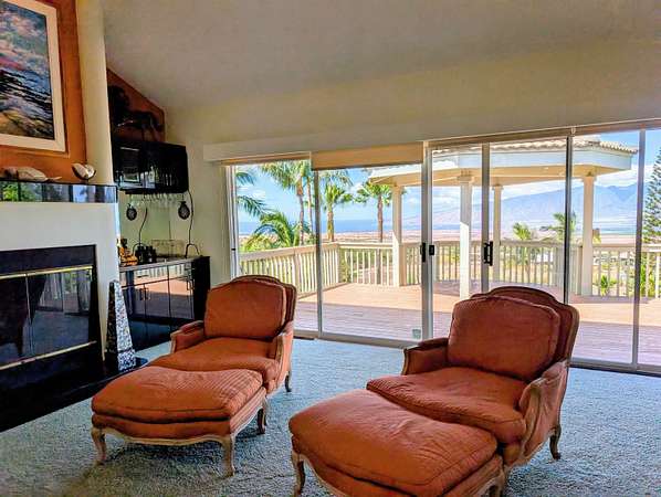 Lower Kula treasure. Set in an ideal drier climate of Omaopio on the lower slopes of Haleakala at approx 1,350 ft elevation, this 4,410 sf home with 5 bedrooms and 5.5 bathrooms on 5 acres of prime Kula ag land offers breathtaking bicoastal views. A spectacular palm-tree lined driveway sets a magical scene for this special Maui property that includes 5-car garage parking, pool & a farm building. From the hilltop garage, the main entry on same level draws you in to the living room, boasting incredible cathedral ceilings, a gourmet kitchen with 6-gas burners, a deck with gazebo that showcases both south & north shore ocean views. The primary bedroom suite, a guest bedroom suite & an office are located upstairs on the same level as the living room & kitchen. Central a/c throughout upper level except for 2nd bedroom. Descend downstairs to find two more bedroom suites, another guest bedroom, all cooled with split-system AC, & a family room with tiki bar that leads to a pool. Downstairs also has the laundry room, another bathroom and storage. All furnishings included with the sale for move-in-ready ease. Ceiling fans throughout. New septic system (1250 gallons) installed in 2017. Priced below recent appraisal. Seller holds active California real estate license.