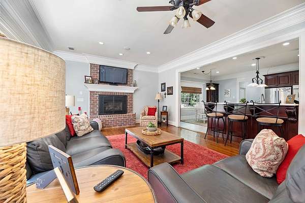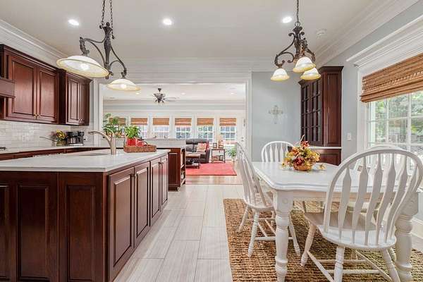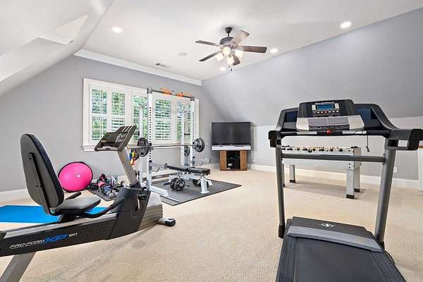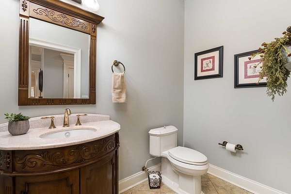 Custom-built home. Winding staircase & grand foyer. Huge master suite with his & hers bathrooms, FP in bedroom & her bath, updated bath with soaking tub, quartz countertops, separate shower & balcony overlooking pond. Three large walk-in closets in master area. All ensuite bedrooms except one Jack & Jill. One BR being used as office. A possible second master suite is on the main level. Lots of deep crown molding & trim. Large workout room with wet bar & cabinets. Media room with large built-in TV, stereo surround sound & FP. Sunroom overlooking pond & deck. Kitchen with upgraded solid mahogany cabinets, large walk-in pantry, new tile floor & quartz countertops. Fresh neutral paint throughout. Plantation shutters in most of home. Basement has privacy & could be 6th bedroom with ensuite bath & unbelievable amount of storage. Screened porch with doggie door to fenced area. Large laundry room with lots of cabinets, folding counter & sink. Elevator to 2nd floor. Matterport Tour: