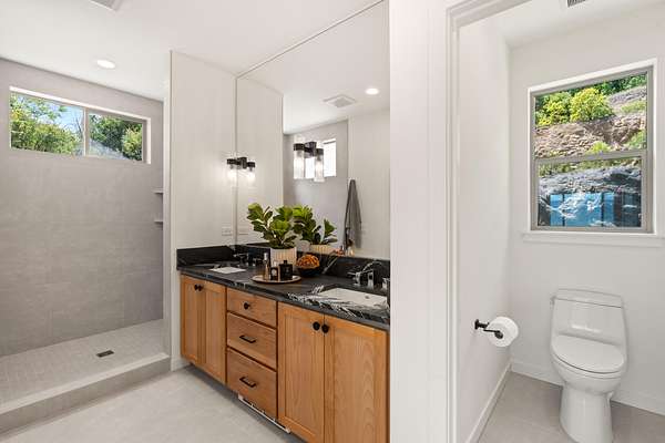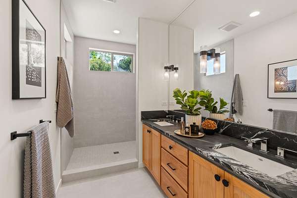 - Breakfast Bar, Built-In Features, Ceiling Fan(s), Double Vanity, Enclosed Toilet(s), Kitchen Island, Linen Closet, Open Floorplan, Pantry, Primary Downstairs, Shower/Tub Combo, Stone Counters, Tile Shower, Vaulted Ceiling(s), Walk-In Closet(s)