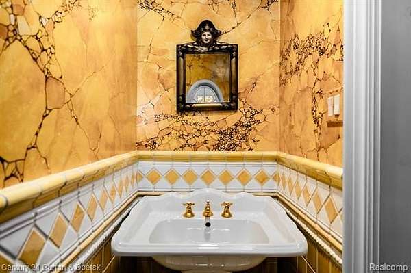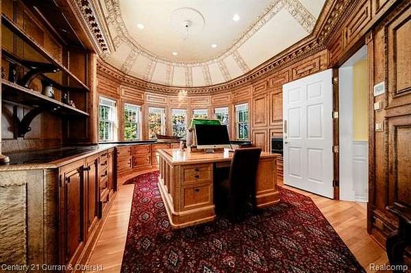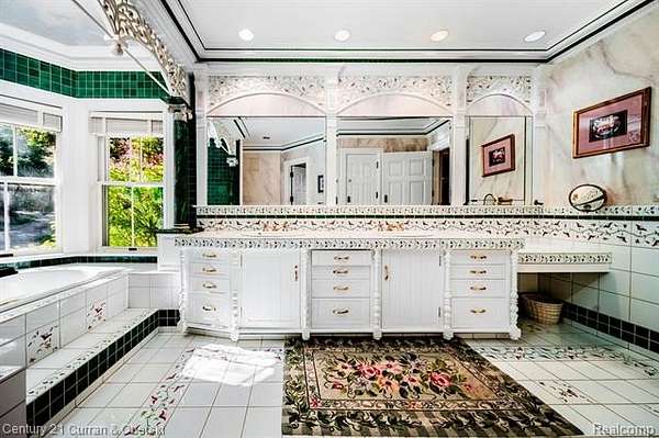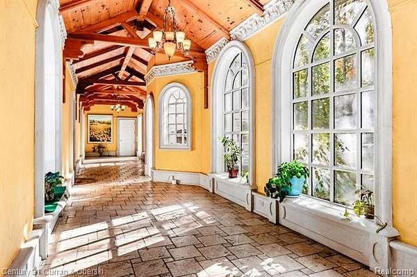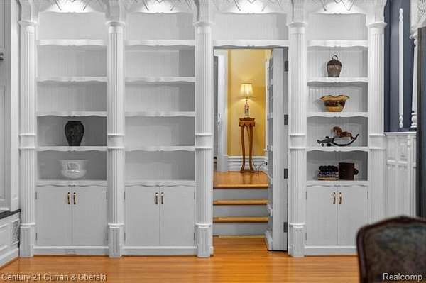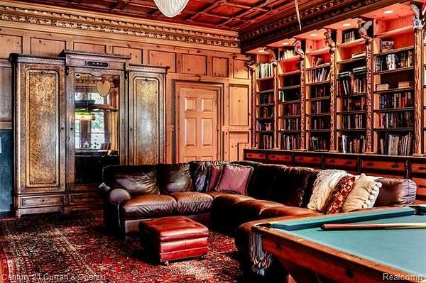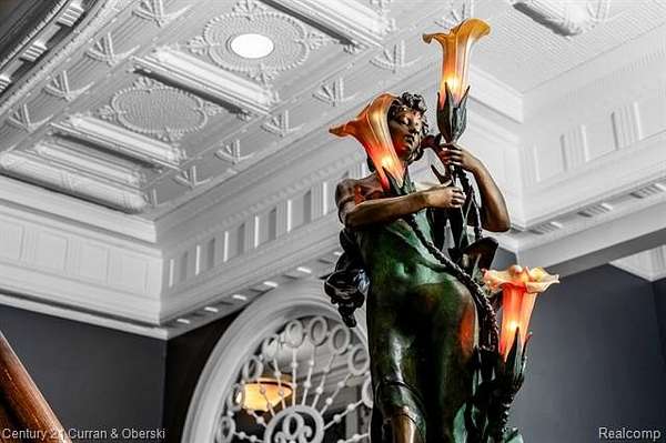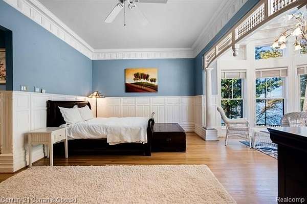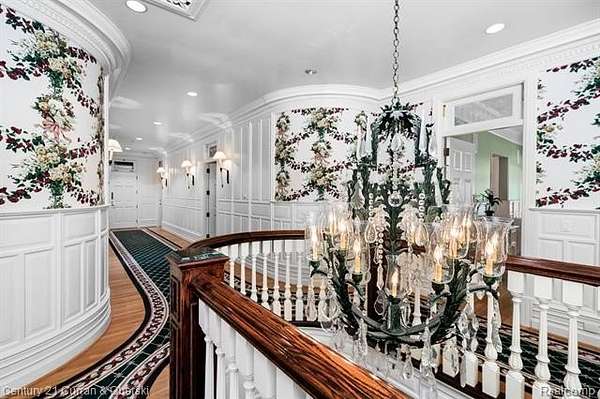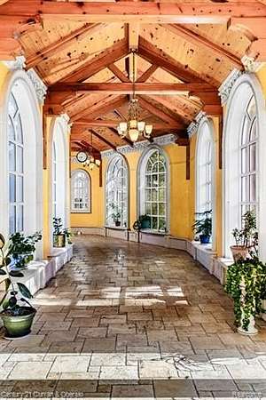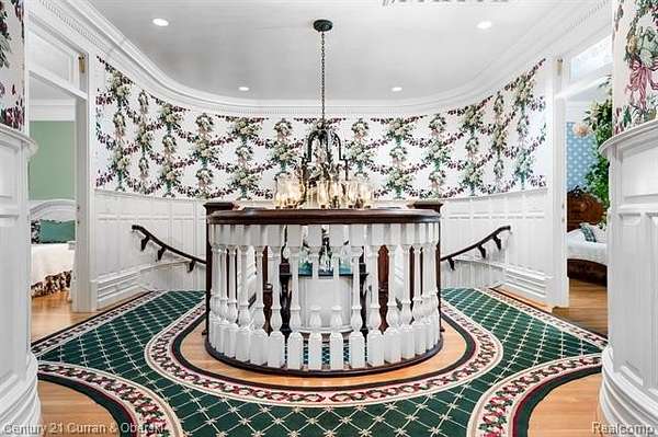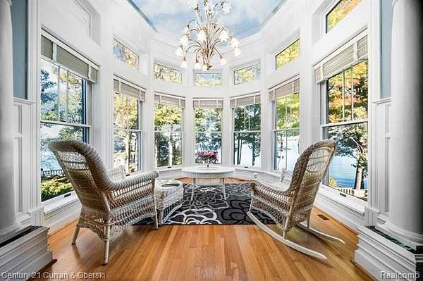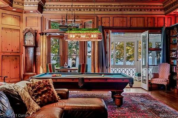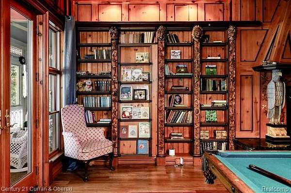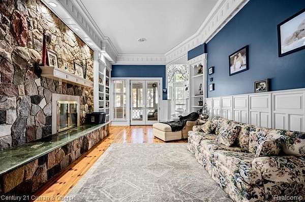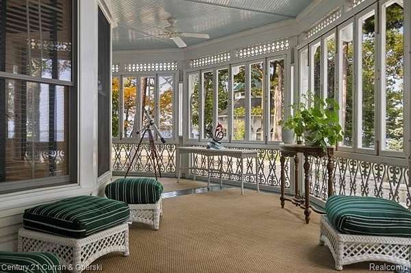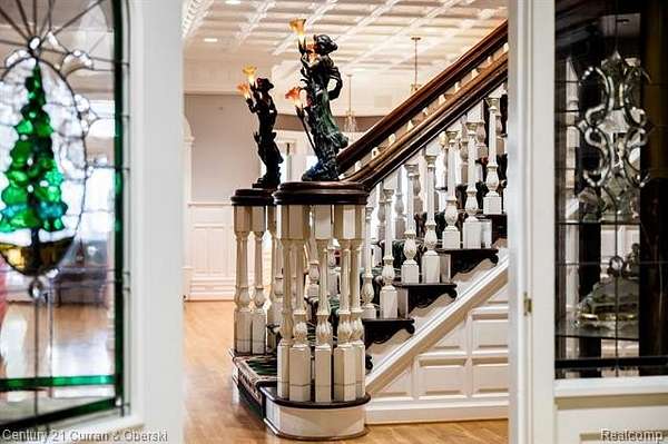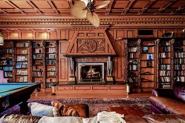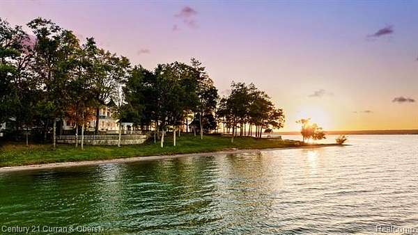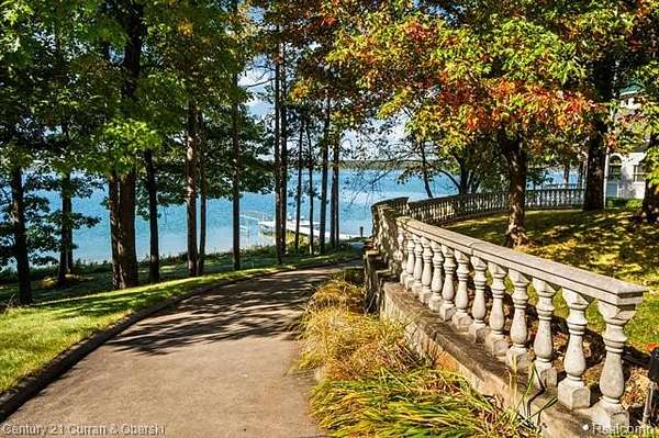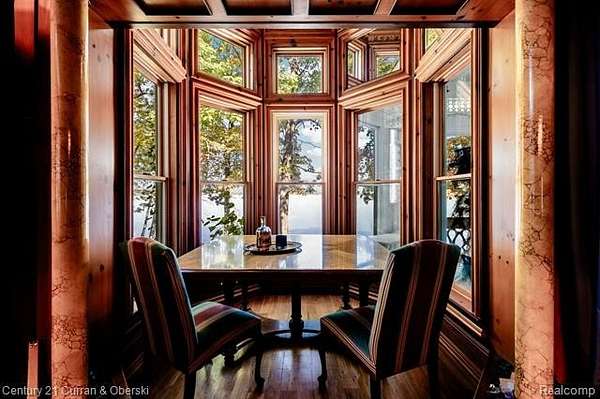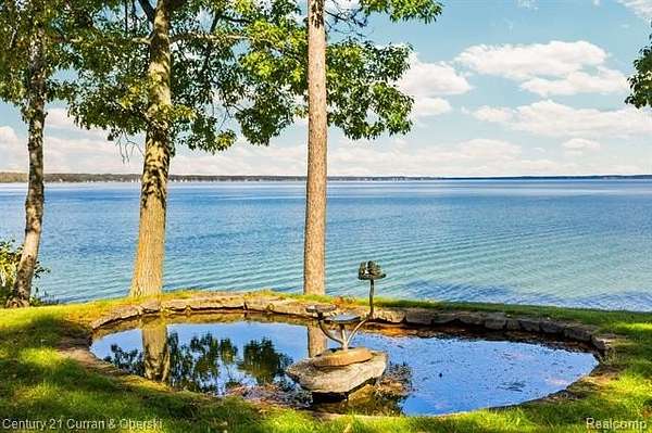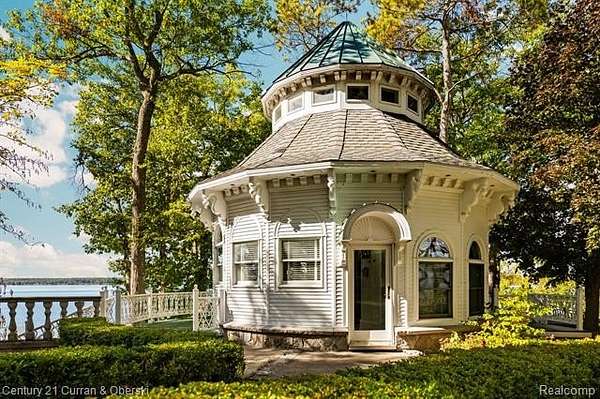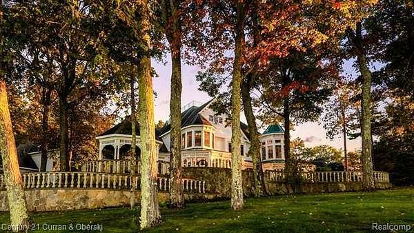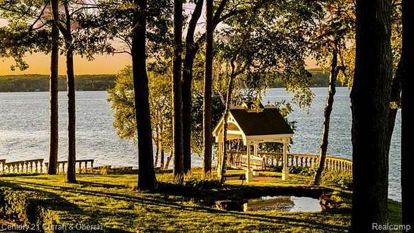Built with exceptional craftsmanship, the home features hand-carved millwork, rare Bird's-eye maple paneling, coffered ceilings, marble fireplaces, and tin-inlaid details. The 1,400-sq. ft. great room centers on a marble fireplace flanked by hand-carved Caryatids with panoramic lake views. A chef's-grade kitchen offers commercial appliances, dual islands, a walk in pantry and custom cabinetry adjoining both formal and casual dining areas. Additional highlights include an exquisite Library and billiards room, a media room, and wet bar with marble counters and nostalgic ice-cream parlor. The home provides 10 bedrooms and 13 baths, including a primary suite with private veranda, office, and spa-style bath. Structural features include radiant in-floor heat in various places of the home, heated quarter-mile driveway and walkways, attached four-car garage, and multiple auxiliary garages. Outdoor amenities feature stone terraces with balustrades, 131-ft veranda, 75-ft covered lakeside porch, multiple fire pits, manicured walking paths, and a lakeside gazebo with full bath, sitting area, spiral loft, and outdoor hearth. Located along Michigan's Inland Waterway with boat access to Lake Huron and Mackinac , Red Pine Point offers extraordinary craftsmanship, privacy, and accessibility.