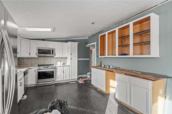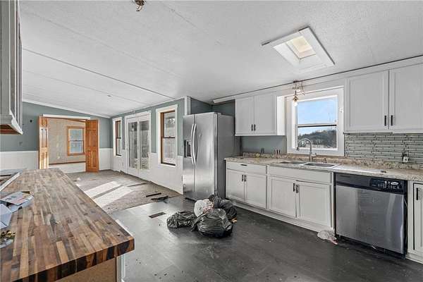 Great remodel and renovation opportunity with solid bones. Some updates have already been started, including a new roof in 2021, offering a strong foundation to make it your own. Three-bedroom, two-bath home set on a quiet 2.5-acre lot. Open and spacious floor plan with plenty of potential. The entry leads into the kitchen, which features stainless steel appliances, a tile backsplash, skylight for added natural light, and a buffet counter with butcher block countertop. Ample cabinetry provides good storage and organization.