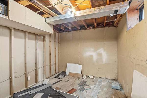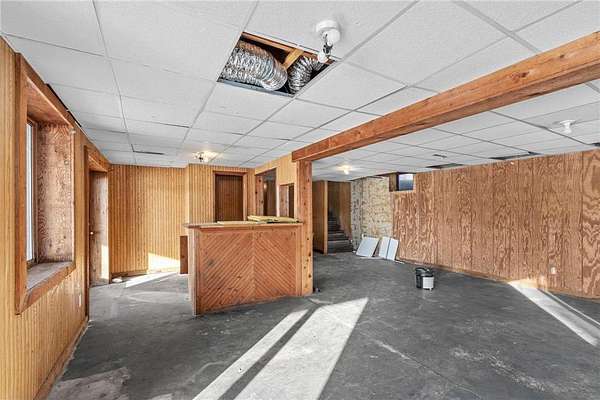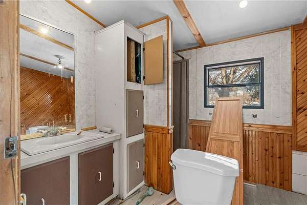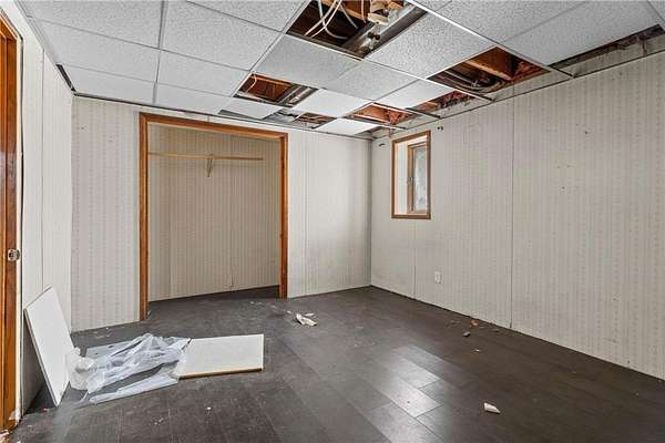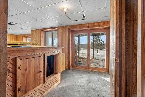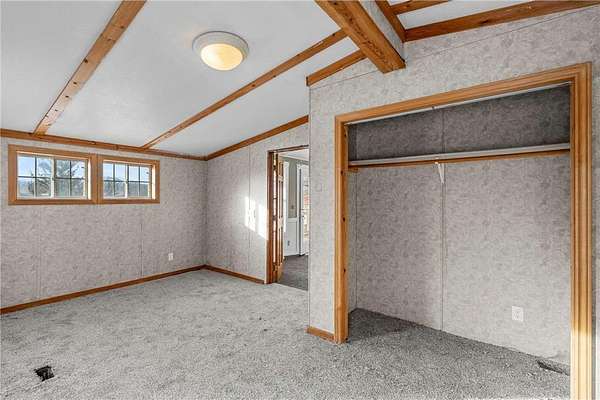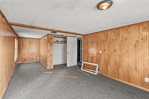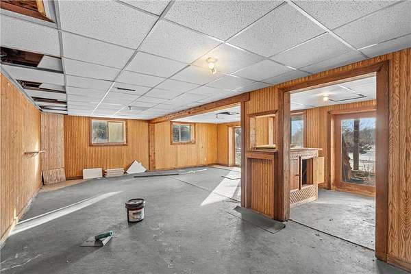 The kitchen opens to the living and dining areas, creating a connected space with vaulted ceilings, carpeting, and walkout access to both the front deck and backyard--ideal for everyday living or entertaining. The main level includes a front entry area with a large closet and a nearby 3/4 bathroom with a walk-in tiled shower, and a vanity for storage. Two bedrooms are located on the main level. The primary bedroom offers vaulted ceilings, carpeting, and a private full bathroom with updated flooring, walk-in shower, jetted tub, and vanity. The second bedroom sits on the opposite side of the home for added privacy and includes carpeting, wood-paneled walls, and multiple windows for natural light. The lower level provides additional living space with a large family room and walkout access to the yard. A built-in wood bar with countertop and storage sits nearby, along with a closet. The lower-level bedroom includes closet space and natural light. Outside, the property offers 2.5 acres of private land with mature trees. An oversized detached three-car garage includes shelving for storage, providing space for vehicles, tools, and outdoor equipment. The expansive front deck spans the length of the home and overlooks the peaceful surroundings. Some updates have already been started, and with solid bones, generous living spaces, and a peaceful 2.5-acre setting, this property offers a great opportunity to continue renovations and add value. Plenty of room to personalize and create a home that fits your vision.