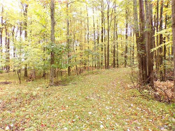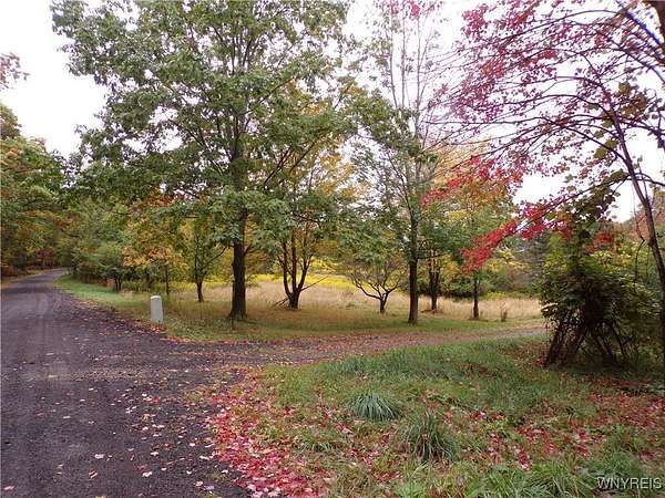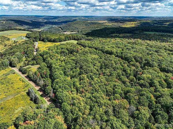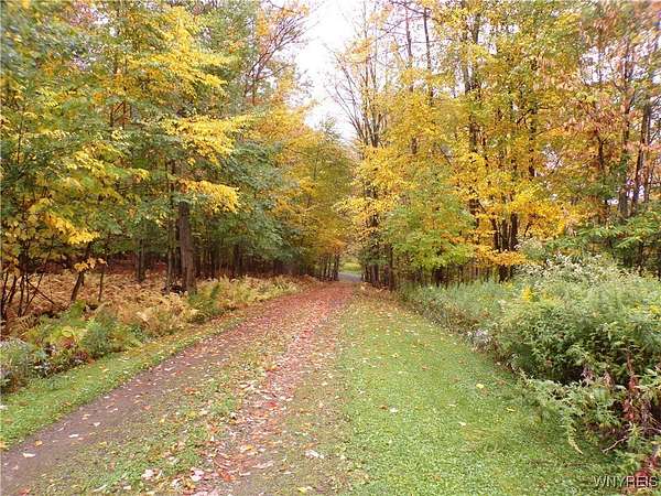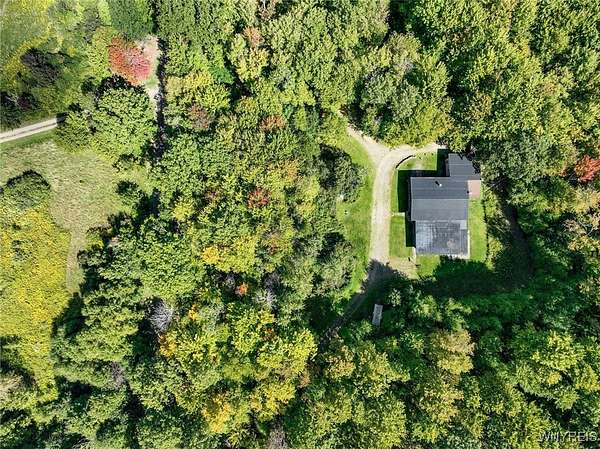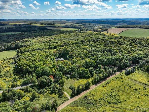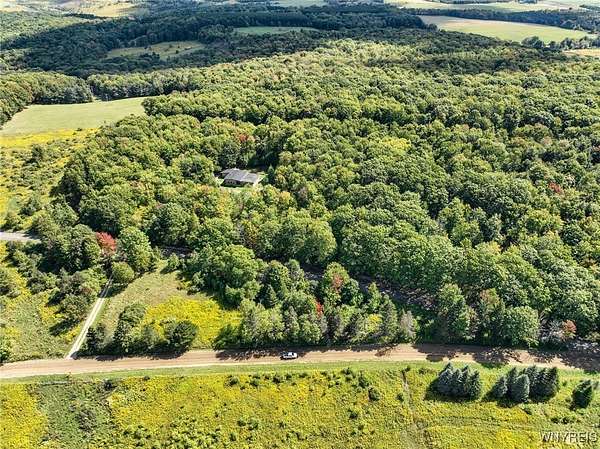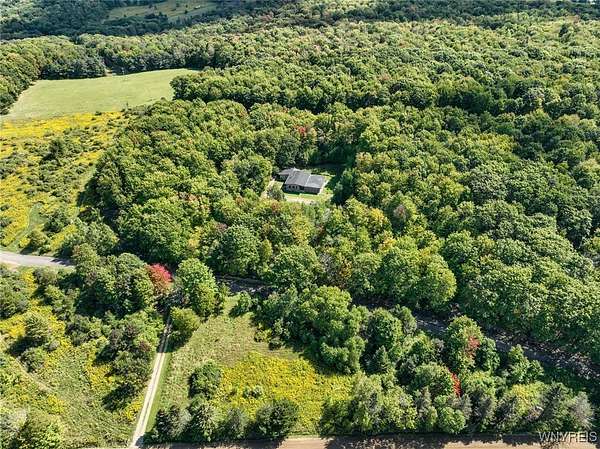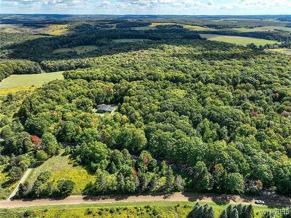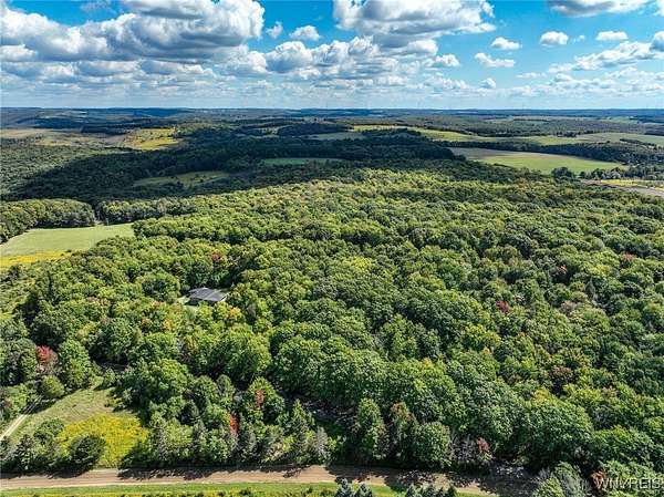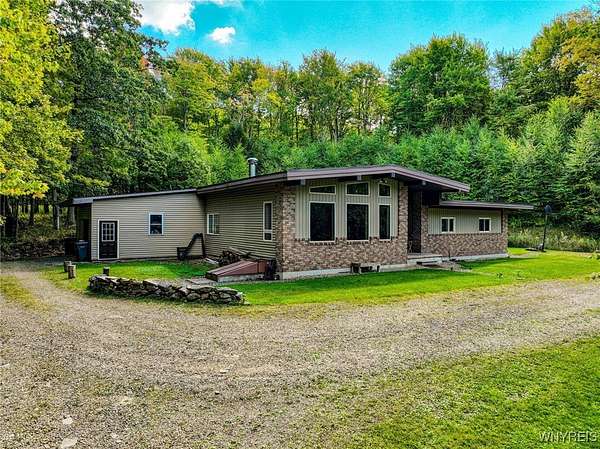 You can feel yourself decompress as you drive through the rolling hills and valley views into the thick canopy of trees. Tucked into the wooded parcel, barely seen from the driveway rests this well constructed contemporary style home. You will feel like you're a million miles away, but yet just a short beautiful 15-minute drive to the village of Wellsville. Enter through the substantial front door with sides and fan lights into the central hall/foyer, soaring 12-foot ceilings create dramatic space in the sundrenched living room with a wall of windows that brings the outside in. The opposing wall of brick, natural wood mantel, hearth and gas fireplace has room for all family and guests. Spacious kitchen/dining room combination with a central island that houses the range, ample counter space and attractive wood cabinetry. Convenient entry to the kitchen from the attached two car garage with drive thru garage door to rear of home. Three spacious bedrooms. Primary bedroom has sliders out to the rear/side patio and Jack-and-Jill style entrance to the bath. With over 2600 sq. ft. this sprawling ranch has great potential to be the home of your dreams. Just bring your imagination and create. Collect on the recently cruised timber value of approx. $35,000 Explore the nearly 23 beautiful acre parcel with walking or riding trails. Hunters' paradise! Don't miss another season or waste your time getting there; it is all right here. Just walk out your door.