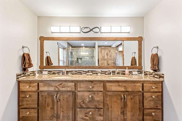 - Breakfast Bar, Ceiling Fan(s), Double Vanity, Granite Counters, In-Law Floorplan, Kitchen Island, Linen Closet, Open Floorplan, Pantry, Primary Downstairs, Shower/Tub Combo, Tile Shower, Vaulted Ceiling(s), Walk-In Closet(s)