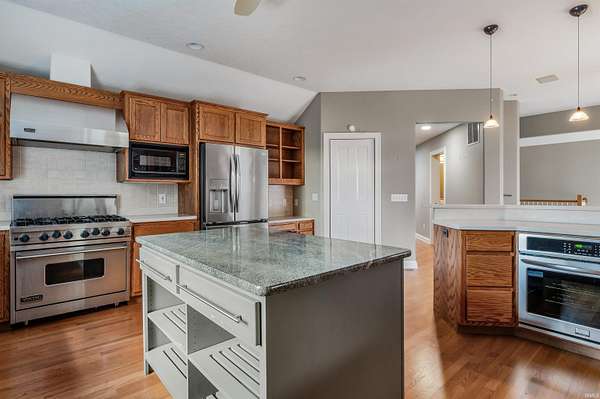 - Countertops-Solid Surf, Deck Open, Dishwasher, Dryer Hook Up Electric, Foyer Entry, Generator Built-In, Kitchen Island, Landscaped, Main Floor Laundry, Main Level Bedroom Suite, Range-Gas, Range/Oven Hook Up Gas, Refrigerator, Sump Pump, Utility Sink, Water Heater Tankless, Water Softener-Owned