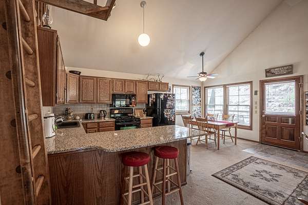 The deeded property is north facing, looking down into the creek that runs across the property. Ponderosa pine, moss rock and cottonwood trees cover the land and provide wonderful hideouts for the deer that frequent the property. The owners have taken great pride in being good stewards of the land and have taken mind to trim low tree branches and reduce pinecone litter to reduce wildfire risk.