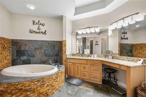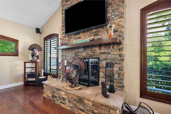 - High Ceilings, Kitchen/Family Room Combo, Living Room/Dining Room Combo, Open Floorplan, Primary Bedroom Main Floor, Stone Counters, Thermostat, Tray Ceiling(s), Vaulted Ceiling(s), Walk-In Closet(s), Window Treatments
