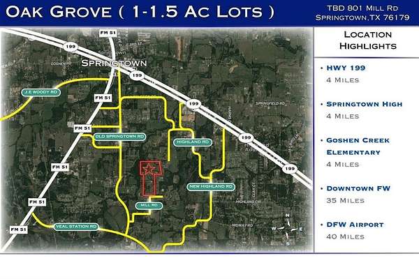 These generous lots, ranging from 1 to 1.5 acres, provide ample space to create your dream home. Utilities have already been installed. Oak Grove is proudly situated in the Springtown Independent School District, making it an ideal place for families.