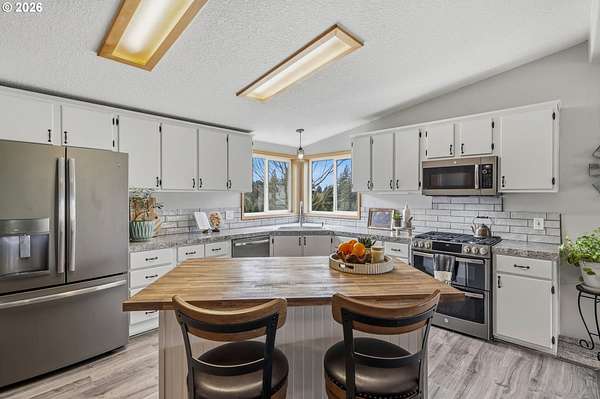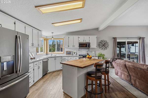 - Dishwasher, Free Standing Gas Range, Free Standing Refrigerator, Island, Microwave, Pantry, Stainless Steel Appliance