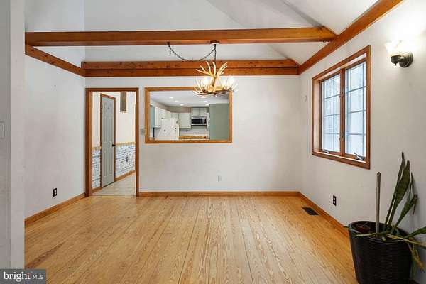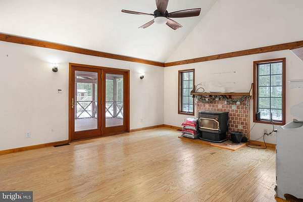 - Breakfast Area, Ceiling Fan(s), Dining Area, Entry Level Bedroom, Exposed Beams, Open Floor Plan, Pellet Stove, Walk-In Closet(s), Window Treatments, Wood Floors