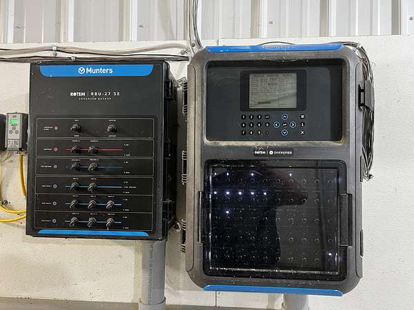 Each house is outfitted with top-tier equipment to maximize efficiency and productivity. Features include a Staalkat egg packer, Rotem controllers, a central egg room (sized for three houses) with a Burch Climate Unit, Munters fans, Lubing drinkers, and LED lighting. The houses also feature Shenandoah double belt nests, two 15-ton feed bins per house including a scale bin, Cyclone feed lines, a Total Radio alarm system, and an incinerator for mortality. City water supplies the operation, and there is a dedicated bathroom with a septic system. A septic tank is also installed near the egg room for added utility.