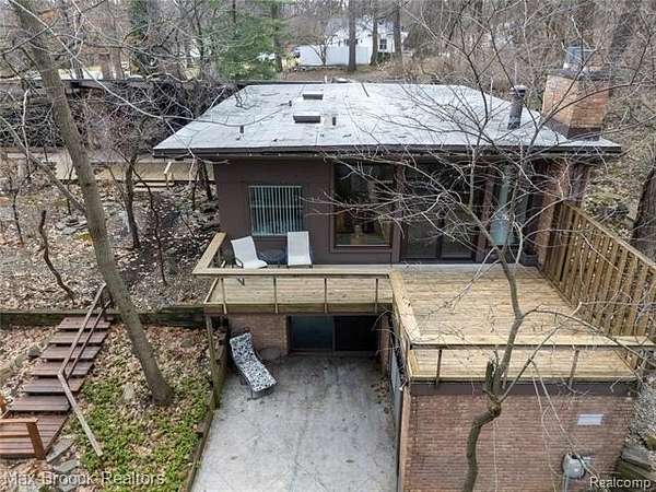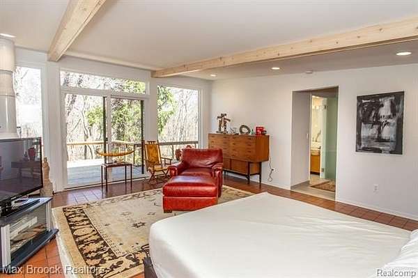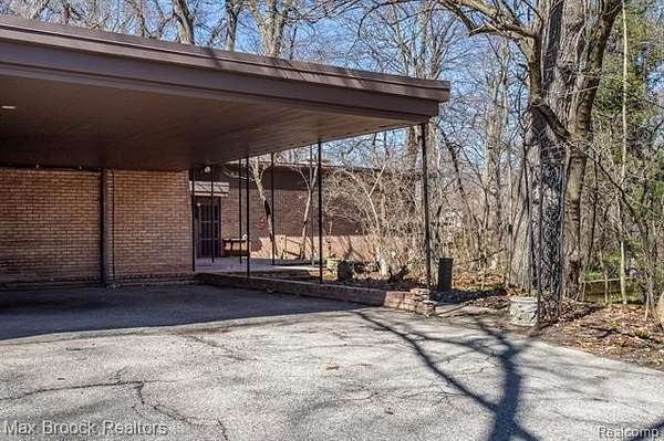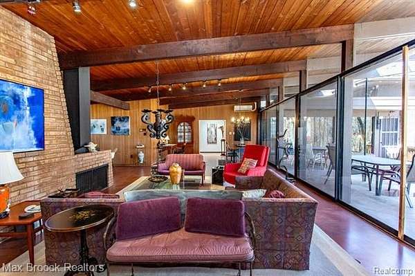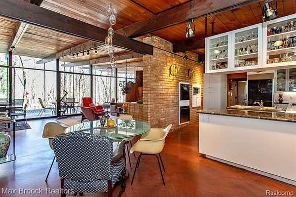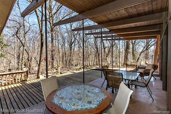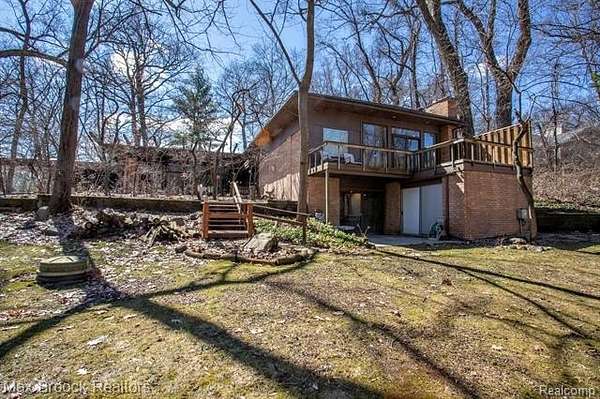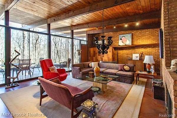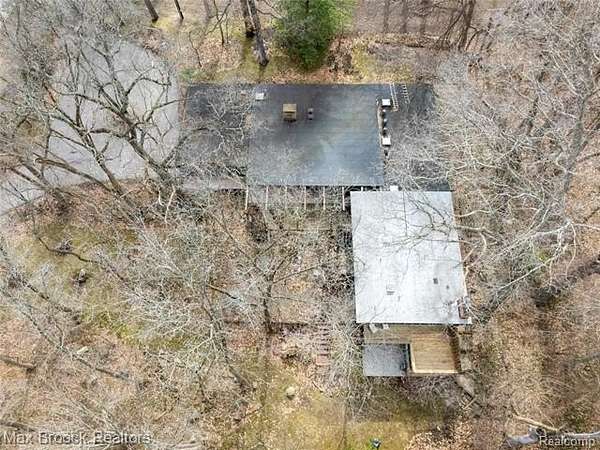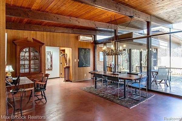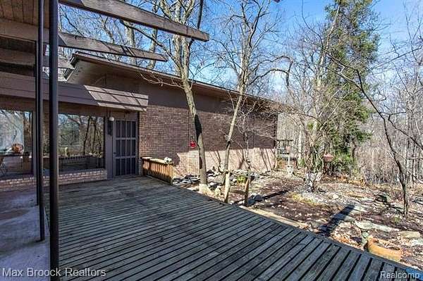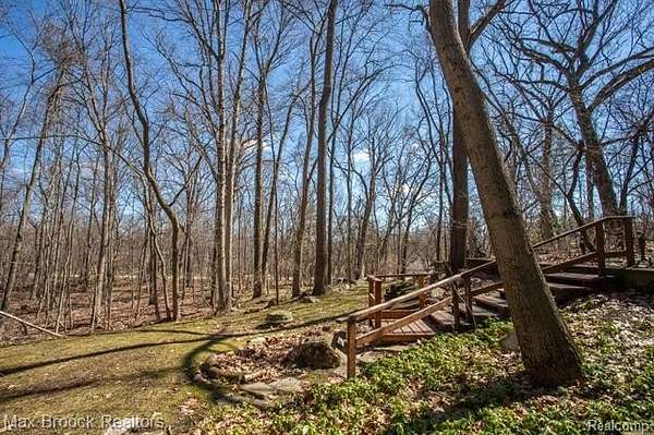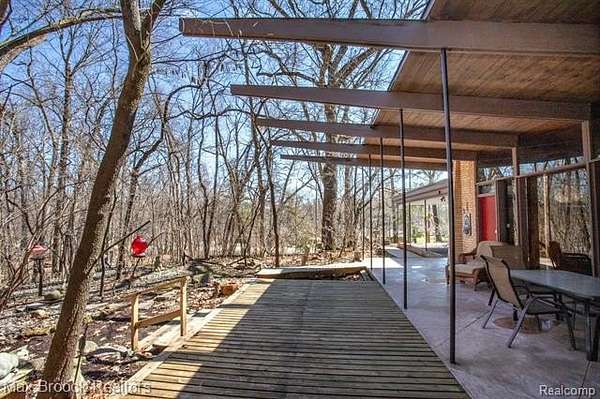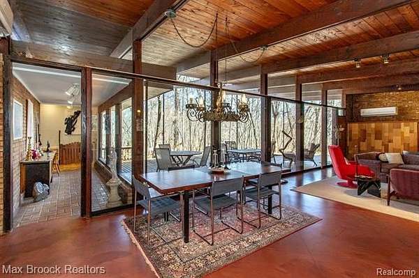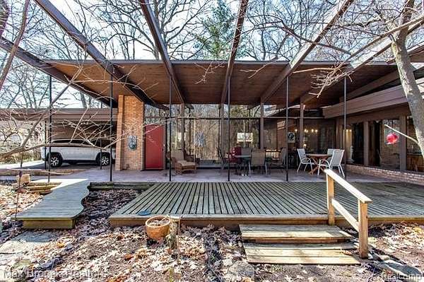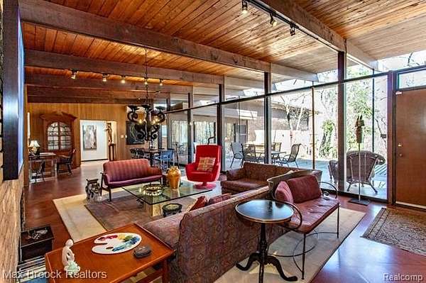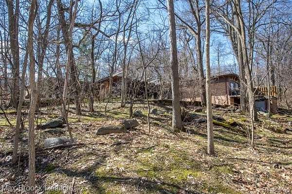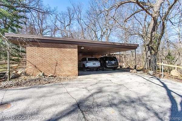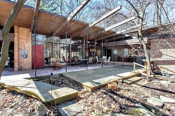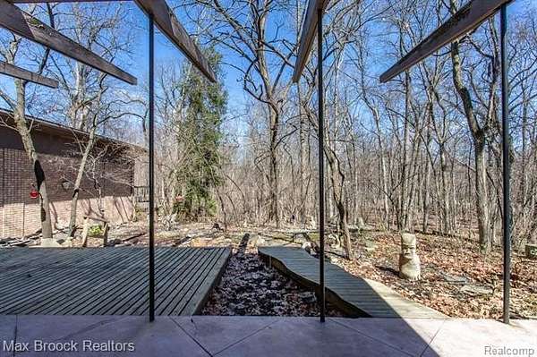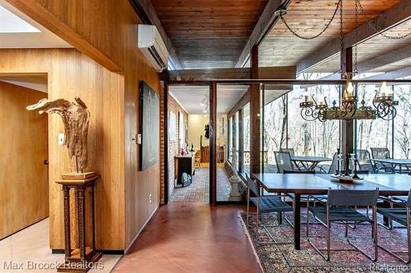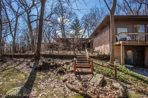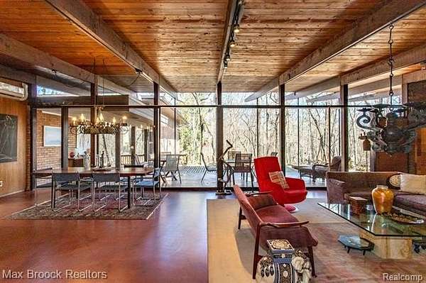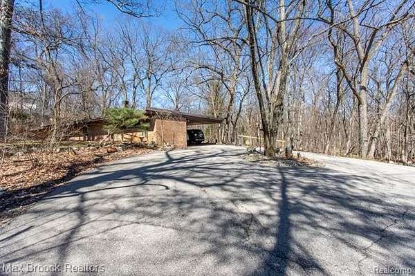 INCREDIBLE Mid-Century architecture on a stunning almost 2.5 acre wooded lot with with 6 bedrooms , 5.1 baths and nearly 4300 sqft of living space. This classic design brings the outside in with a wall of floor to ceiling windows and exposed beams that stretch from the interior and through the windows to the 30 foot covered patio . The open floor plan includes, soaring ceilings, custom wood panelling, a huge living room and dining room that are open to each other and flow seamlessly into the large kitchen separated only by the Mid-Century stacked brick fireplace. The main floor plan includes 4 bedrooms, one currently being used as a den , two full baths as well as a powder room and a large mud/laundry room that are conveniently located off of the entrance to the car port. An expertly designed addition was added in 2012 that includes a gallery hallway leading to a fabulous primary suite with a library/sitting room, two full baths and a large primary room with a doorwall that leads out to a balcony with stunning second floor views of the Rouge river and the over 2 acre lot. The addition includes a walk out lower level with a family room and fireplace currently being used as an artists studio as well as a full bedroom and bathroom. the house sits high and back off the road for uninterrupted views to the outdoors. If you love stunning Mid-Century architecture you will fall in love with this expansive, beautifully preserved raised ranch masterpiece that makes you feel like you are miles away in your own tranquil retreat. Expertly designed to fit in its surrounding in nature.