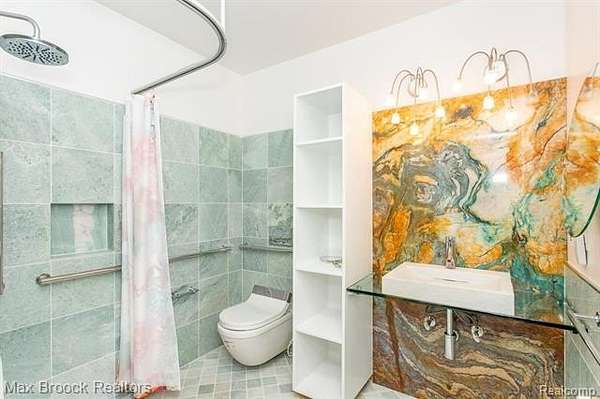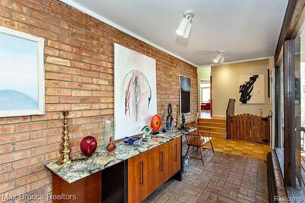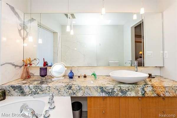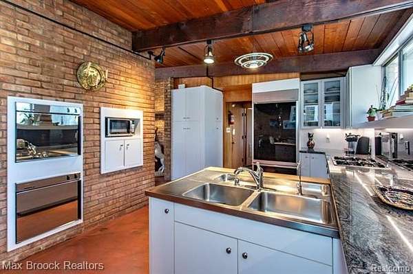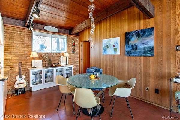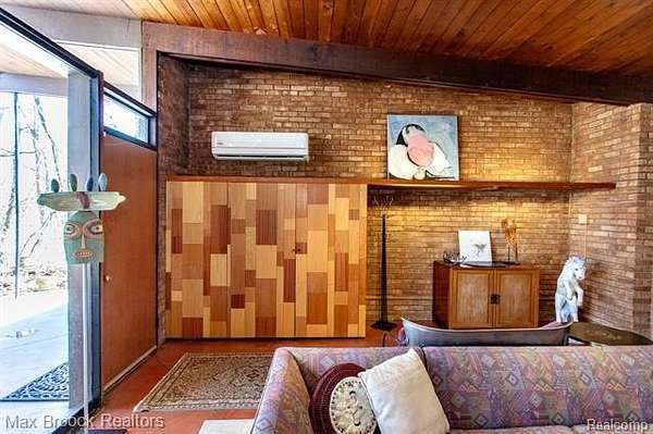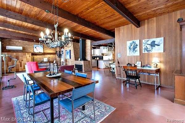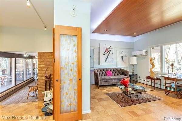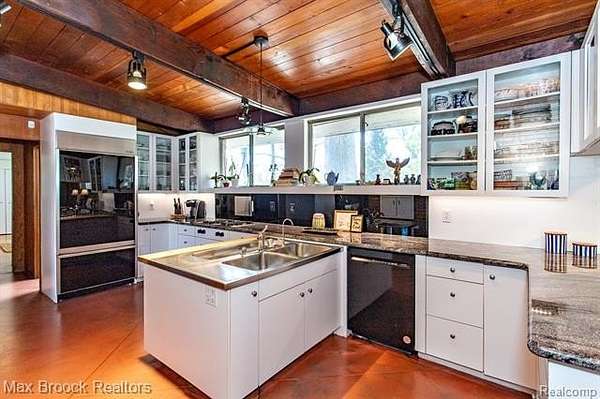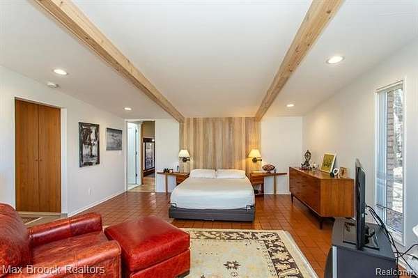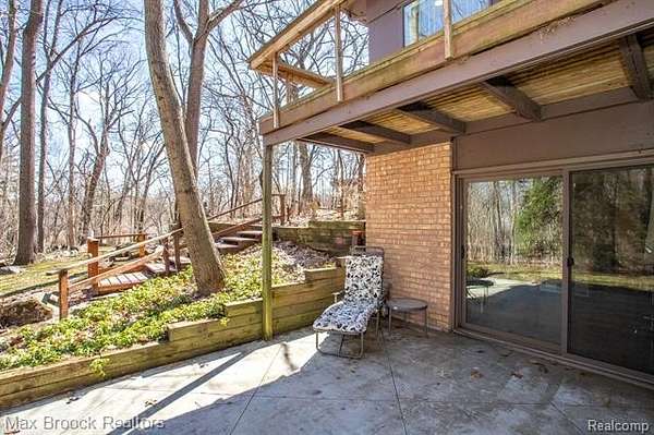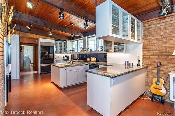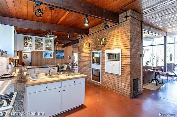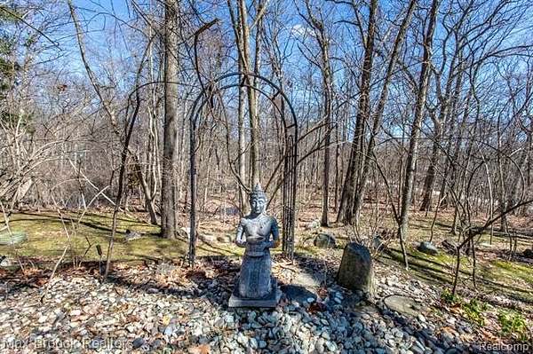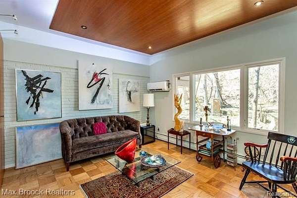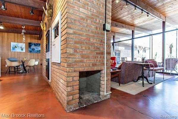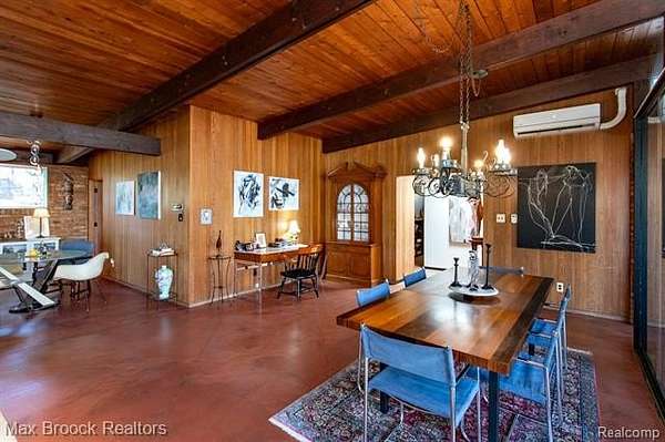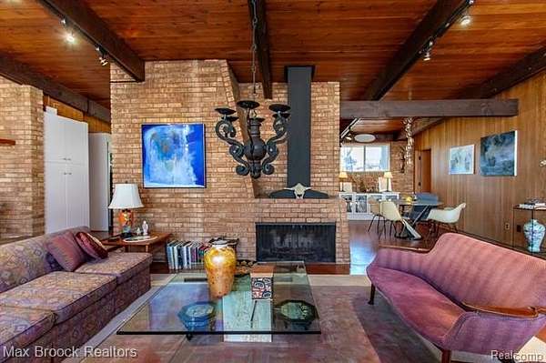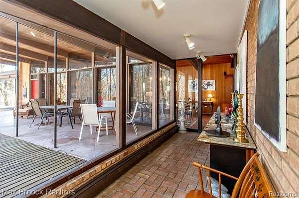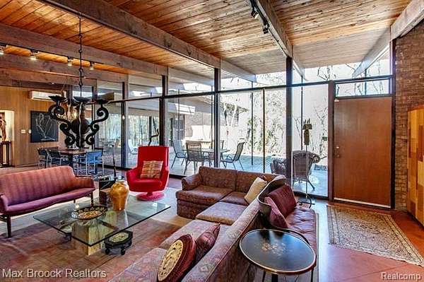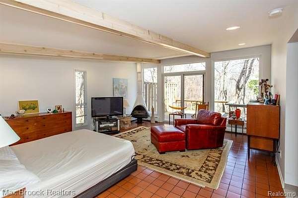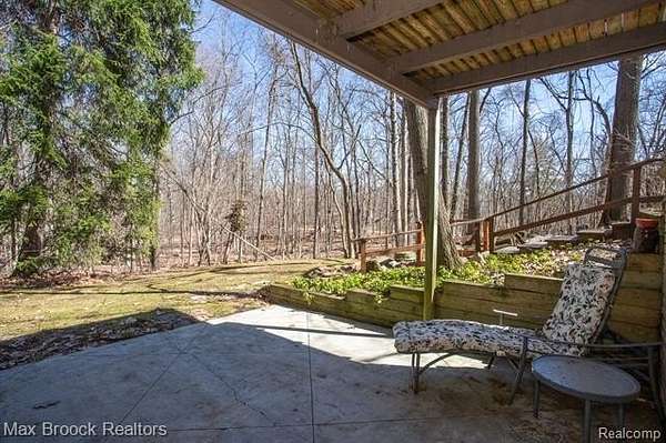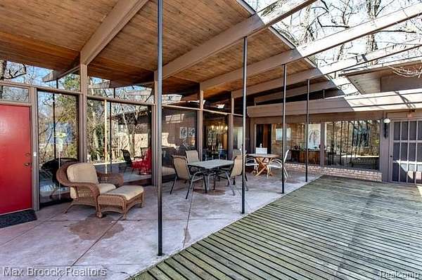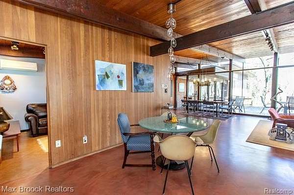 INCREDIBLE Mid-Century architecture on a stunning almost 2.5 acre wooded lot with with 6 bedrooms , 5.1 baths and nearly 4300 sqft of living space. This classic design brings the outside in with a wall of floor to ceiling windows and exposed beams that stretch from the interior and through the windows to the 30 foot covered patio . The open floor plan includes, soaring ceilings, custom wood panelling, a huge living room and dining room that are open to each other and flow seamlessly into the large kitchen separated only by the Mid-Century stacked brick fireplace. The main floor plan includes 4 bedrooms, one currently being used as a den , two full baths as well as a powder room and a large mud/laundry room that are conveniently located off of the entrance to the car port. An expertly designed addition was added in 2012 that includes a gallery hallway leading to a fabulous primary suite with a library/sitting room, two full baths and a large primary room with a doorwall that leads out to a balcony with stunning second floor views of the Rouge river and the over 2 acre lot. The addition includes a walk out lower level with a family room and fireplace currently being used as an artists studio as well as a full bedroom and bathroom. the house sits high and back off the road for uninterrupted views to the outdoors. If you love stunning Mid-Century architecture you will fall in love with this expansive, beautifully preserved raised ranch masterpiece that makes you feel like you are miles away in your own tranquil retreat. Expertly designed to fit in its surrounding in nature.