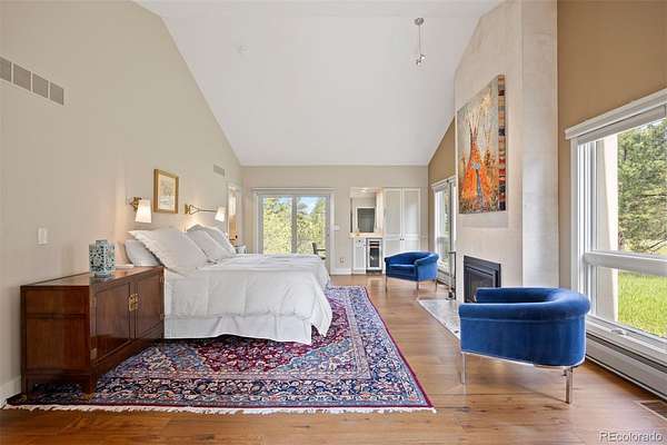 Inside, the home blends mid-century character with modern refinement. Vaulted ceilings and walls of glass bring scale and light, while details like the open-riser staircase and wide-plank wood floors ground the space in warmth. The kitchen is a centerpiece, with a massive marble waterfall island and peninsula with breakfast bar seating, Wolf and Sub-Zero appliances, a bright windowed dining nook, and a separate scullery with commercial-grade refrigeration. The main-floor primary suite enjoys its own fireplace, a private patio, and spa-like bath with refined finishes. Upstairs, two ensuite bedrooms and a loft with built-in beds provide exceptional guest accommodations, while a main-floor den offers flexibility for work or retreat.