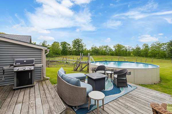 This beautifully updated 3-4 bedroom, 2-bath home offers the perfect blend of historic charm and modern efficiency. Nestled on 32.01 acres of peaceful countryside, it features wide pine board floors, a cozy wood stove in the living room, and exposed beams that highlight the home's rustic elegance. Bright skylights and large windows flood the interior with natural light, while the built-in heat pumps ensure year-round comfort. Recent upgrades include a foam-insulated basement, new siding, windows, and updated insulation, all contributing to improved energy efficiency. The spacious layout offers ample room for family and guests, and the 2-car garageaEUR"currently used as a horse barnaEUR"can easily be converted back to its original use. For equestrian enthusiasts, a pasture field is ready for your animals. Step outside to enjoy a private swimming pond, beautifully maintained flower gardens, and open skies perfect for sunsets and stargazing. The property is a haven for wildlife, including deer, herons, and an abundance of songbirds and bluebirds, creating a truly tranquil setting. A solar-heated saltwater pool is negotiable, offering additional outdoor enjoyment. This property features a 3-bedroom septic design, offering future flexibility. Ideally located just minutes from Bangor, Belfast, Ellsworth, and the coast, this home delivers the perfect balance of privacy, nature, and convenience. Pool is negotiable. Sauna does not convey.
