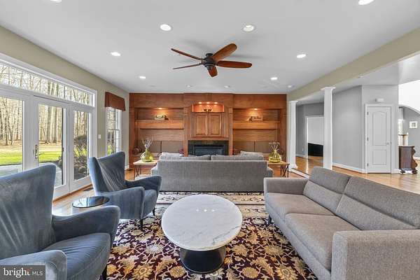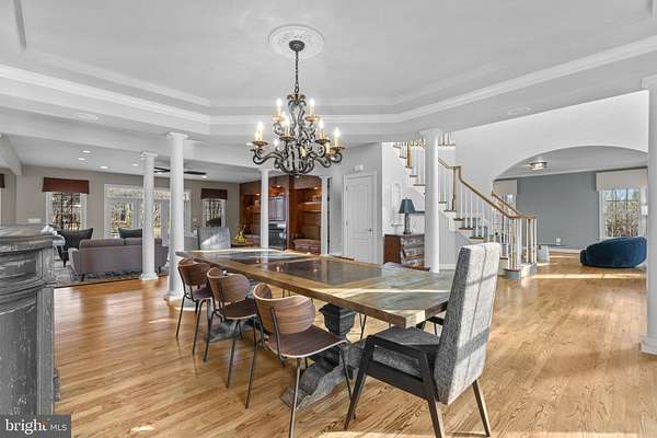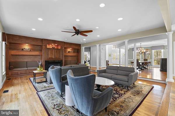 Impressive and exceptionally private Colonial residence set on a nearly 4-acre homesite in sought-after Hawksfield Estates, meticulously maintained by the original owners. Rich in character and timeless design, this home offers a warm yet refined atmosphere, blending elegant architectural details with comfortable, thoughtfully designed living spaces. // A long private driveway leads to beautifully landscaped, wooded grounds and a stately brick facade, while a front path lined with lush shrubs and a retaining wall creates a grand and welcoming approach. Inside, a soaring two-story foyer with gleaming hardwood floors sets an elegant tone, flanked by a formal dining room adorned with columns, a chair railing, a tray ceiling, a chandelier, and oversized windows that fill the space with natural light. Opposite, a formal living room is accessed through a charming arched doorway and offers an equally bright and inviting setting. // The main level continues with a versatile bedroom featuring dual access to a full bath before opening to an expansive great room. The family room serves as the heart of the home, showcasing rich hardwood floors, architectural columns, and stunning custom built-ins with bench seating with storage underneath flanking a cozy gas fireplace, creating a warm and inviting gathering space. // The gourmet eat-in kitchen is thoughtfully designed with granite countertops, an oversized island with bar seating, and high-end appliances including a Wolf(R) 6-burner gas cooktop with a vent hood, a Sub-Zero(R) refrigerator, a Wolf(R) wall oven and built-in microwave, and a Bosch(R) dishwasher. Custom cabinetry offers a beautiful mix of open shelving, glass fronts, and contrasting finishes, complemented by a warm, detailed backsplash and a peninsula that connects to a sunlit breakfast room with direct patio access. A well-appointed mudroom with a built-in desk, storage, and bench seating provides convenient garage access and connects to a laundry room (washer replaced in 2025) and a stylish powder room. // Upstairs, LVT flooring extends throughout four spacious and well-appointed bedrooms and three full baths. The expansive primary suite offers a tray ceiling, a dual-sided gas fireplace, a comfortable sitting area, and two custom walk-in closets. The luxurious ensuite bath features dual vanities with a dedicated makeup station, a corner soaking tub, a separate shower, and a private water closet. Two secondary bedrooms share a dual-access bath, while a third enjoys its own private bath along with built-in bookshelves, window seats, and custom cabinetry, adding a little charm. // The fully finished walk-up lower level provides exceptional additional living space, including a spacious recreation area with built-ins and a wet bar, a private office or library behind French doors featuring extensive custom built-ins, a media room, an exercise room, a full bath, and a storage/utility room. // Outdoor living is equally impressive, with three expansive paver patios totaling approximately 1,000 square feet, a pergola, a built-in space for a hot tub, and a 4-burner grill connected to a gas line-ideal for elevated entertaining and enjoyment. The expansive backyard features a tranquil waterfall feature/dry pond, lush landscaping, and a wooded backdrop for added privacy, along with an underground sprinkler system for both lawn and planting beds. // Additional highlights include built-in speakers (for a future Sonos(R) or other sound system) throughout the main living areas, owner's bathroom, and patio, a 12KW generator, and a Tesla charger in the garage.