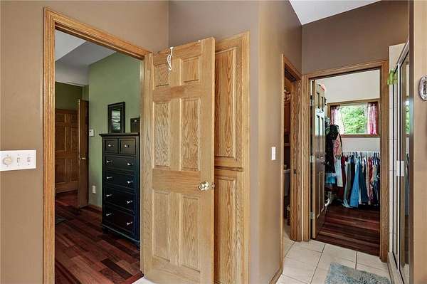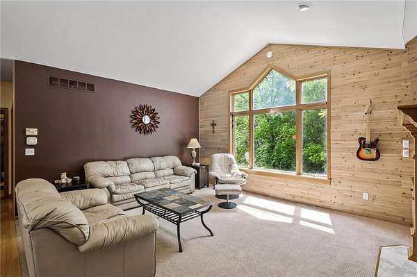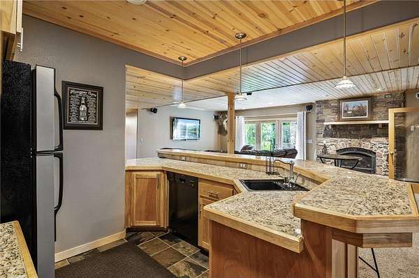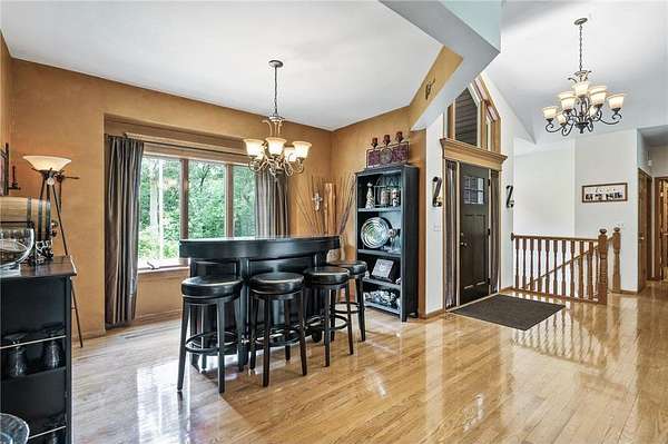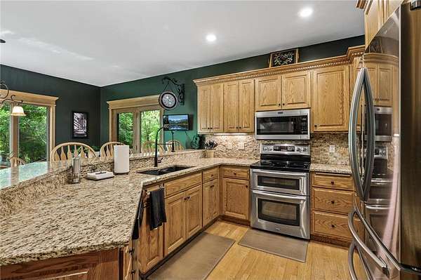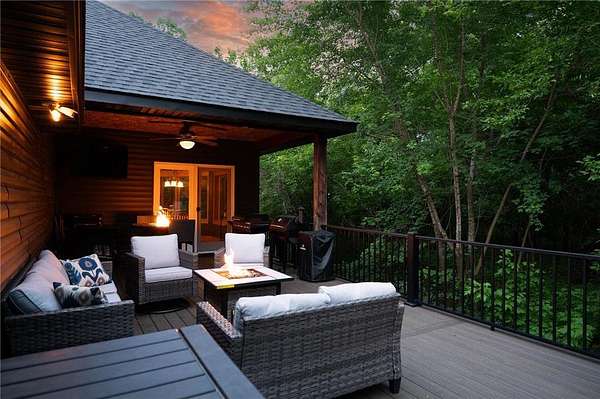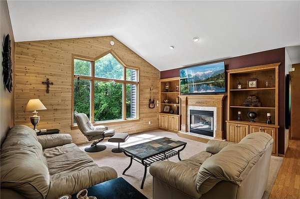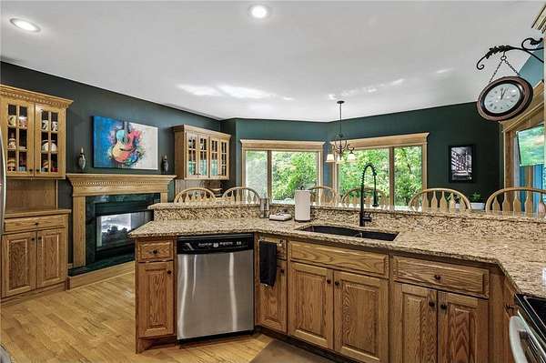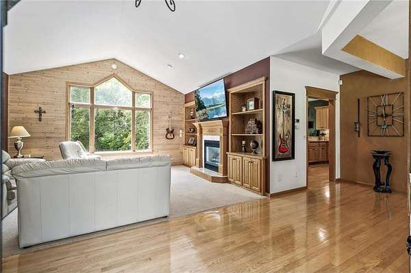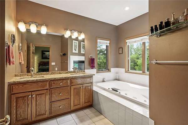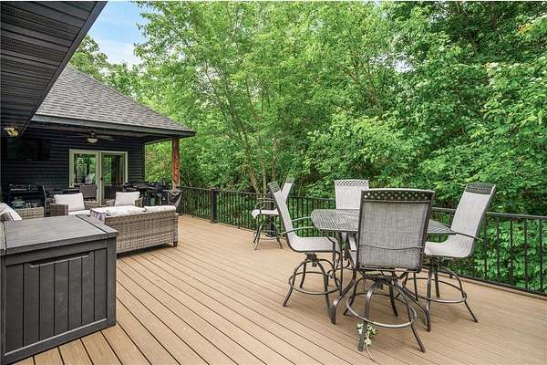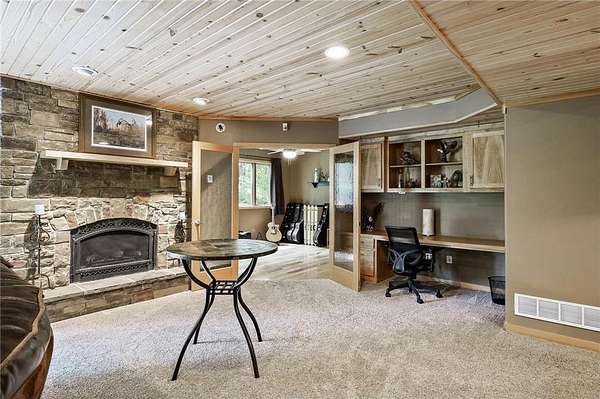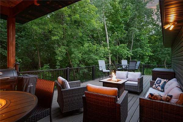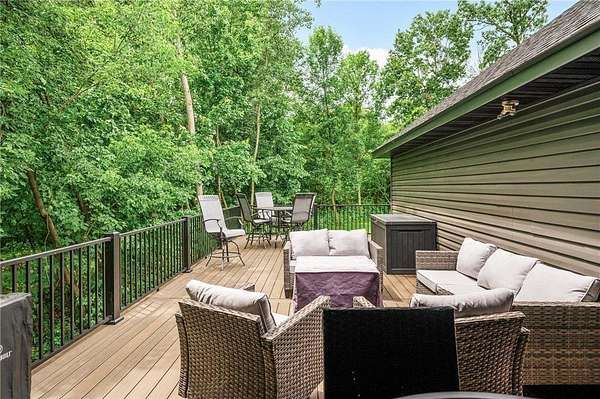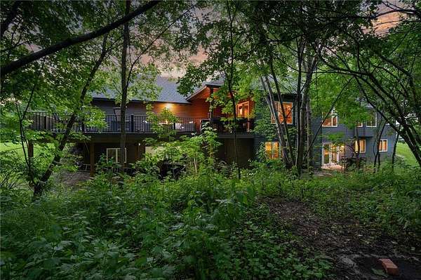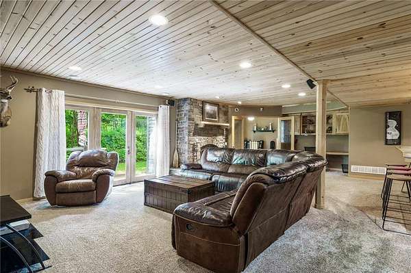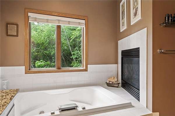 Enjoy all living facilities on one level, including main-floor laundry. The kitchen features stainless steel appliances, granite countertops, and a see-through gas fireplace connecting to the informal dining and living room. Step out from the kitchen onto a brand-new, oversized maintenance-free deck--perfect for entertaining or relaxing in the peaceful wooded setting. The primary suite includes French doors, a walk-in closet, dual vanities, a jacuzzi tub, walk-in shower, and another see-through fireplace between the bedroom and bathroom for added warmth and luxury. The walkout lower level offers a spacious family room with a gas fireplace, a fully equipped wet bar (wine cooler, fridge, microwave, sink, dishwasher), and quick access to the finished, heated tuckunder 2-car garage. Three more bedrooms are located downstairs, including one with french doors, and a large walk-in closet w/built-in-shelving--ideal for a home office. The updated lower-level bath features dual sinks, a jacuzzi tub, and a large walk-in shower. Additional features include: Heated 3-car upper garage with epoxy floors and tongue-and-groove walls | New roof, siding, driveway, and A/C | 75-gallon water heater (2020) | Extensive tree clearing for enhanced space and light | Backyard pond and front perennial garden. This home combines luxury, functionality, and unmatched privacy in a beautiful natural setting. With thoughtful updates, spacious living areas, and a premium location, this is truly a rare find. Schedule your private showing today!