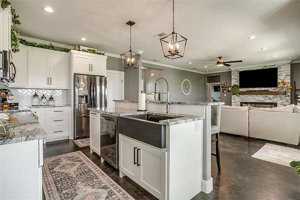 Open-Concept Living The heart of the home features a seamless flow between the living, kitchen, and dining areas. Enjoy a cozy tumbled stone electric fireplace, granite countertops, a generous walk-in pantry, and a welcoming eat-at bar ideal for entertaining.