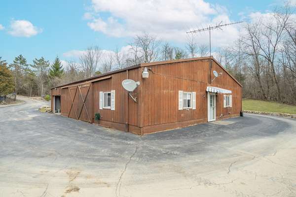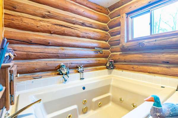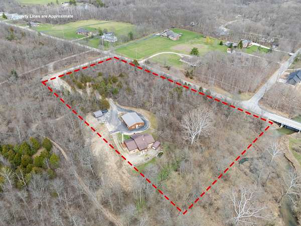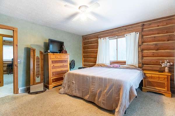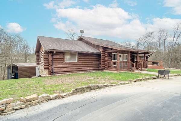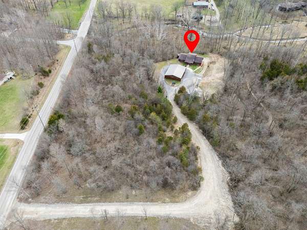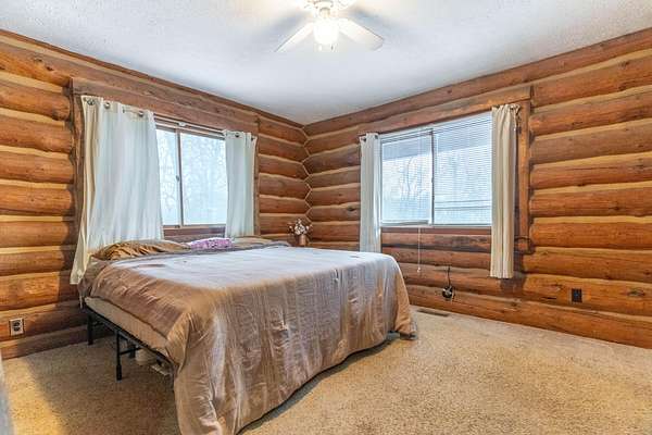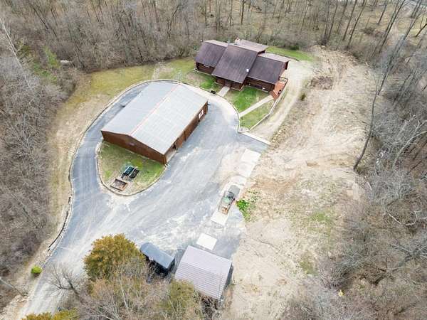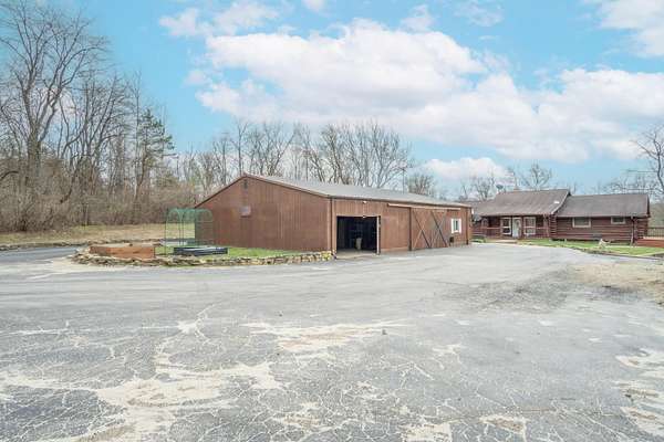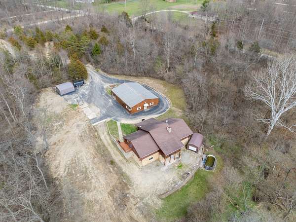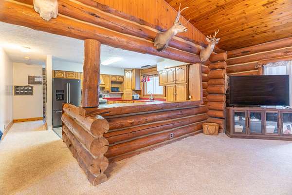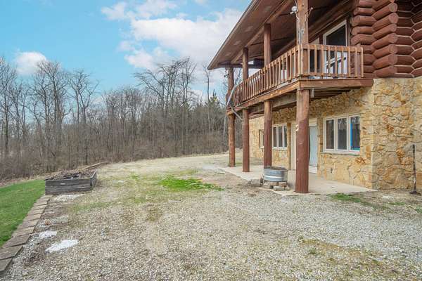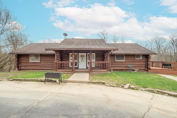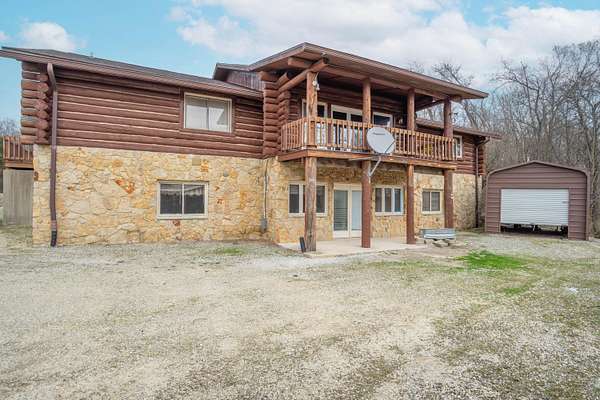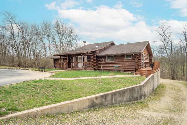 Nestled on 6.84 wooded acres, this log cabin property offers privacy, space, and versatility. The home features 3 bedrooms and 2 full bathrooms with a total of 4,160 sq ft, including a walk-out basement that provides ample living and entertaining space. Vaulted ceilings and two wood-burning fireplaces add warmth and rustic character throughout. Enjoy the peaceful setting from the covered front porch or back deck, with a creek running alongside the property. A detached 5-car garage includes a 2-bedroom attached apartment, offering flexible use options or potential rental income. Major updates include a heat pump installed in 2023 and a roof approximately 7 years old. Surrounded by woods and nature, this log cabin offers an ideal blend of privacy, functionality, and country living.
