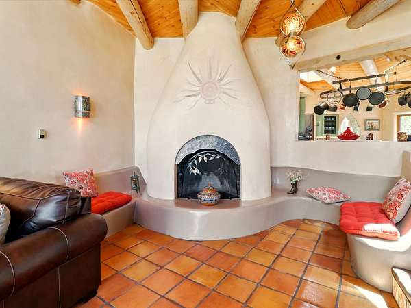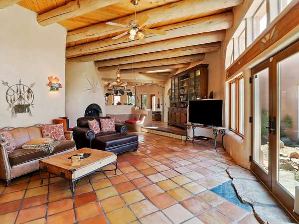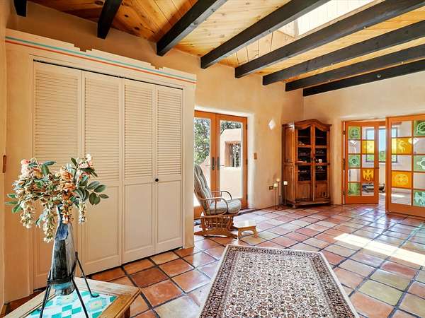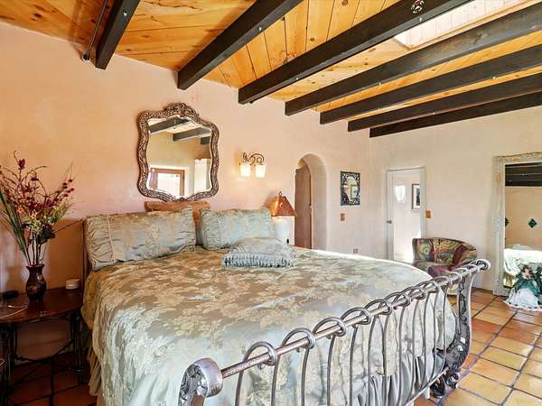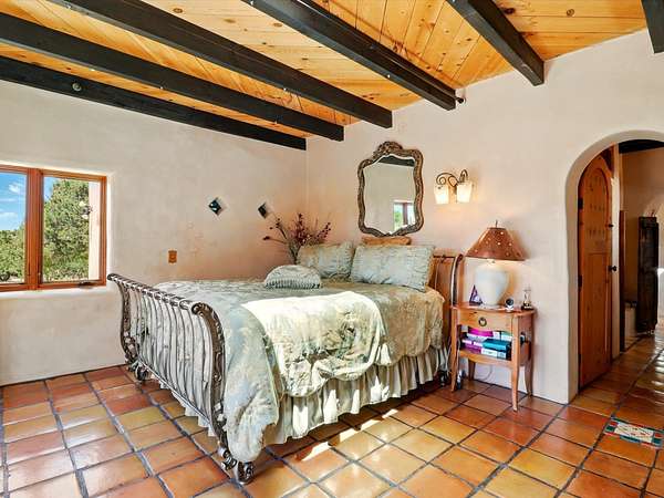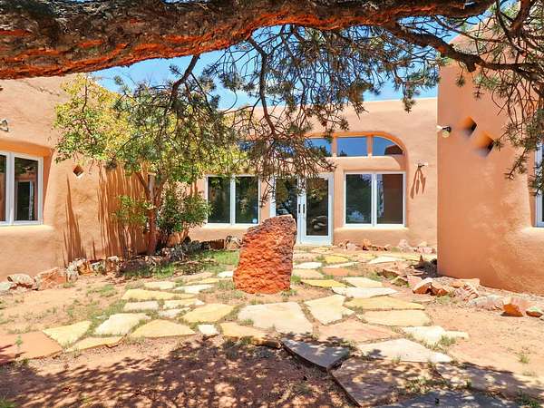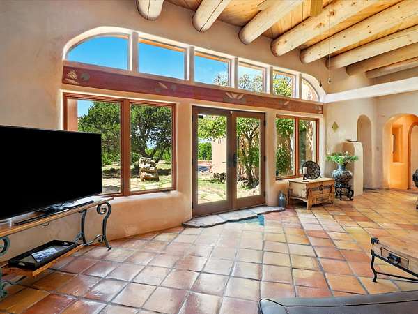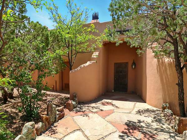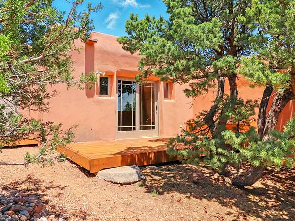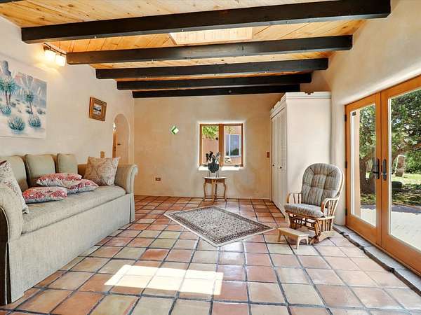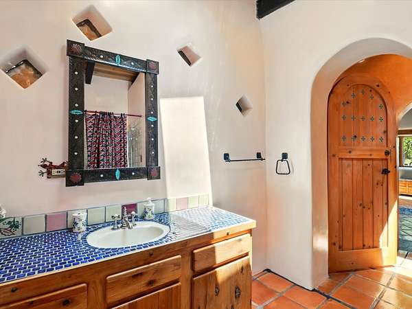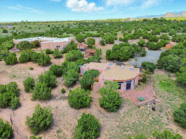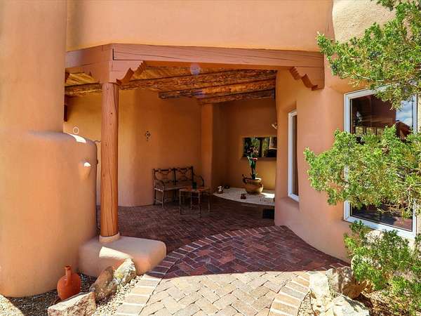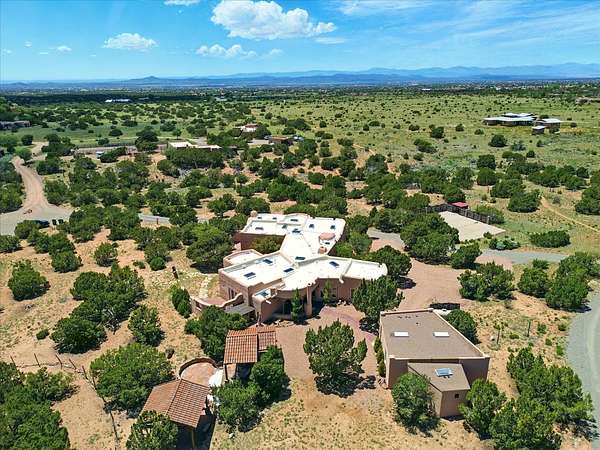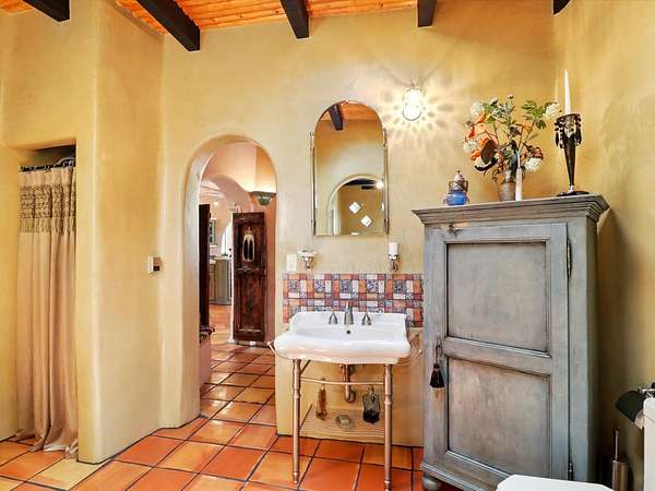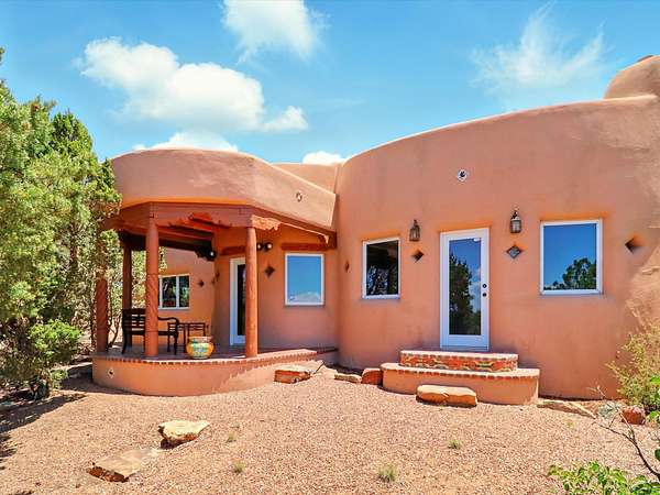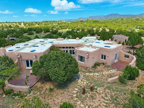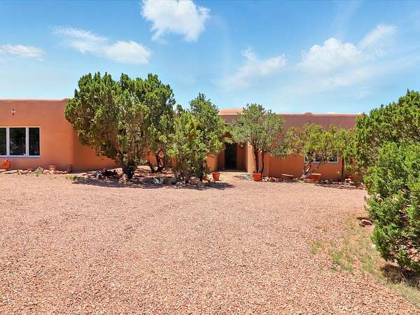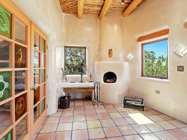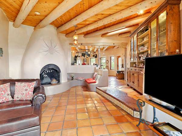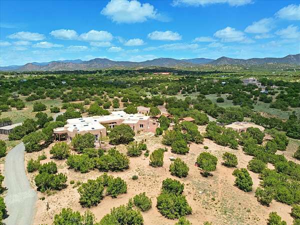 Enchanting Adobe Retreat with Guest Casita on 5 Private Acres - A timeless sanctuary nestled in the foothills of Santa Fe, where every sunrise brings serenity and every sunset invites reflection. For over three decades, this property has been cherished and curated, blending rich Santa Fe tradition with European influences. Begin your mornings on the covered kitchen patio, coffee in hand, as the sun rises over the Sangre De Cristo Mountains. Inside, the heart of the home unfolds with a kitchen island overlooking the living room's doors and windows - framing an ornamental cherry tree and a 300-year-old pinon tree. This custom adobe overflows with craftsmanship. Hand-carved beams, herringbone latillas, corbels, nichos, and structolite plastered walls speak to the region's architectural heritage. Thoughtful design details elevate the space: Venetian glass lighting, custom fixtures crafted by local artisans, and elegant Italian porcelain baths with satin nickel finishes from "Santa Fe by Design." Enjoy year-round comfort thanks to thick adobe walls, Marvin doors and windows, and radiant in-floor heating throughout the home. As the day winds down, indulge in a soak in the luxurious 6-foot clawfoot tub, gazing out the large picture window by sunset. Multiple portals - two attached and two detached - offer peaceful spots to unwind, each with its own perspective of the lush 5-acre grounds. Designed as an equestrian property, the land is both functional and magical, offering serenity, privacy, and space to explore. Included is a charming and fully private custom adobe guest house - perfect for guests or as a proven income-generating rental. 31 A&B Hondo Trail is more than a home; it's a living piece of art, a place of beauty, peace, and purpose. Come experience the enchantment for yourself. MAIN HOME HAS A NEW ROOF INSTALLED MAY 2025