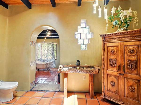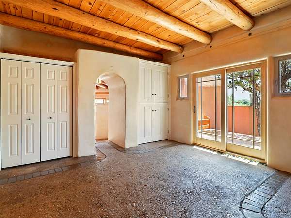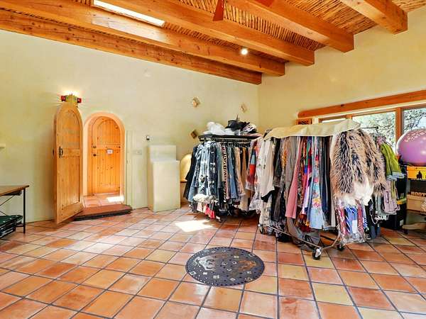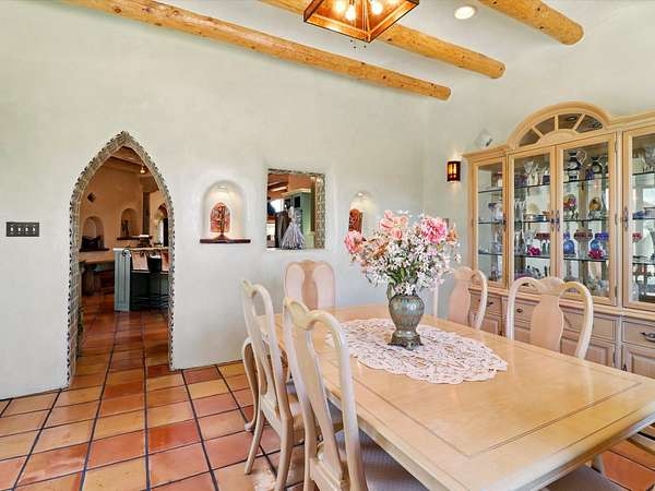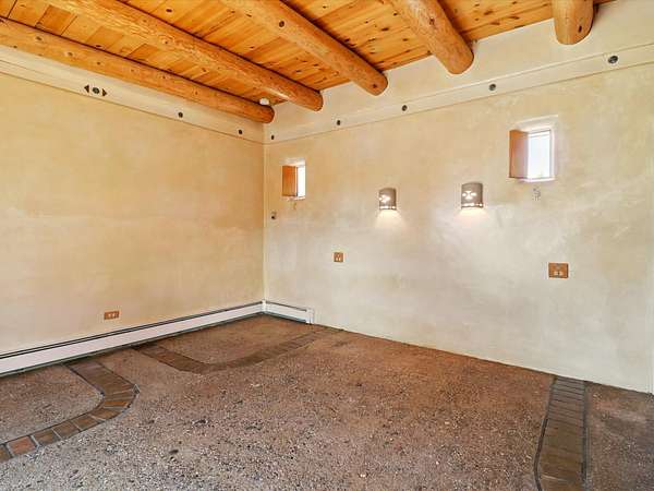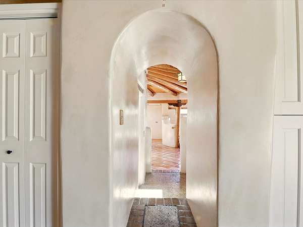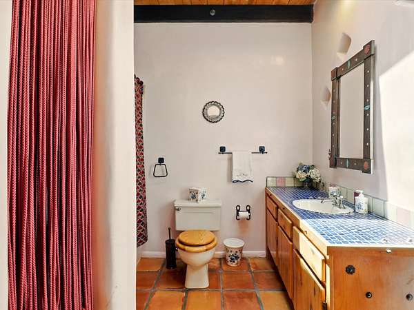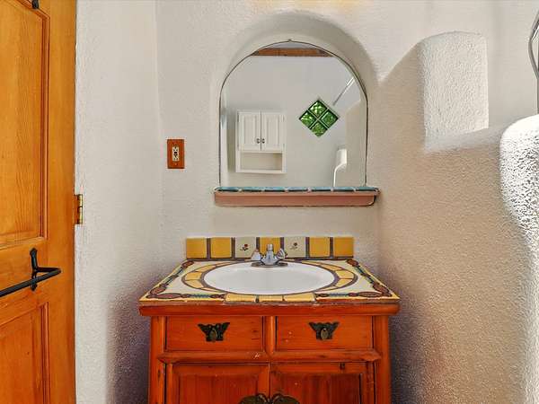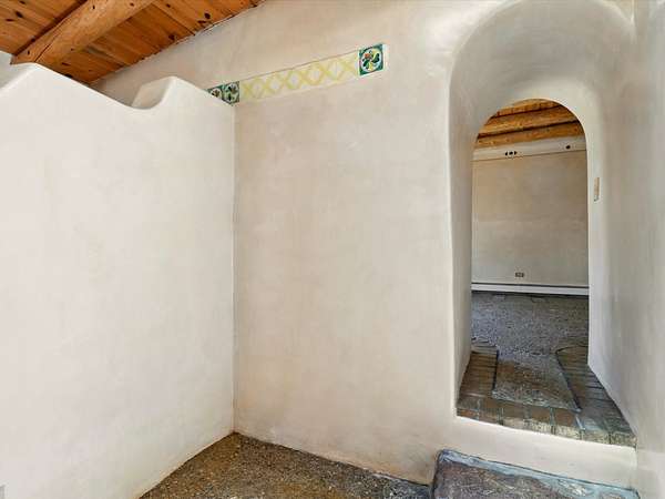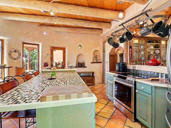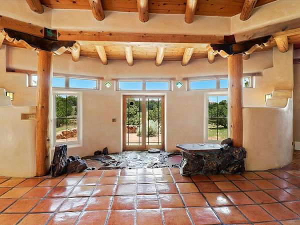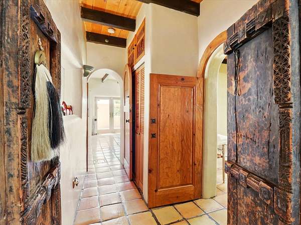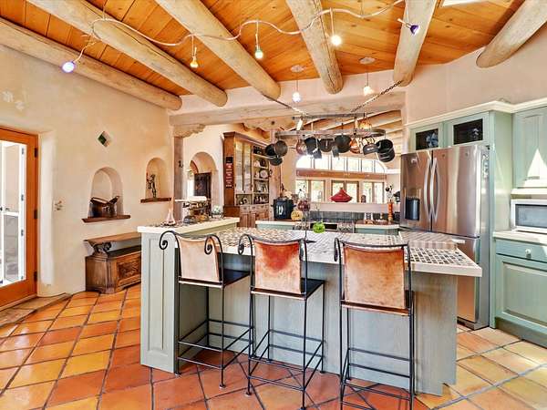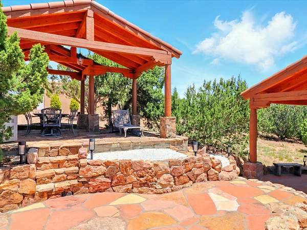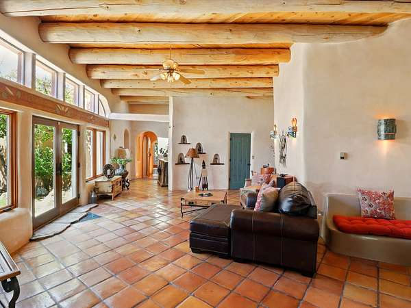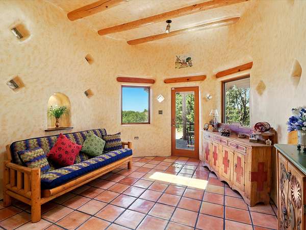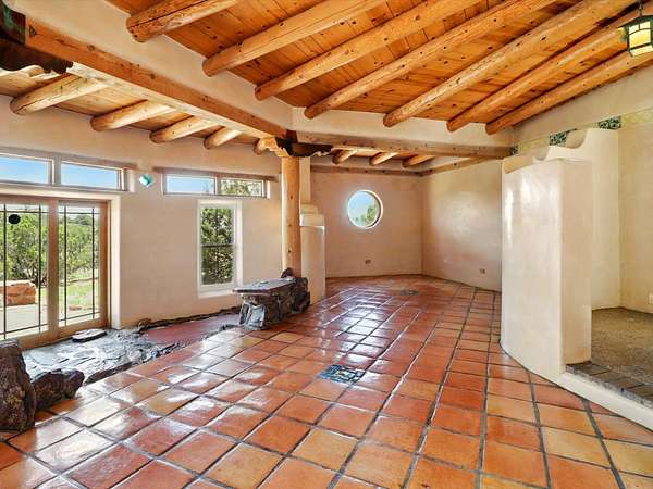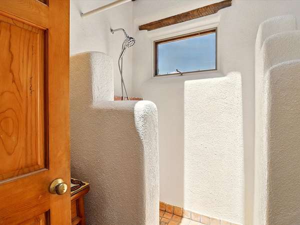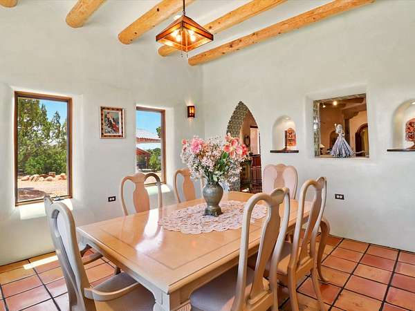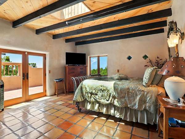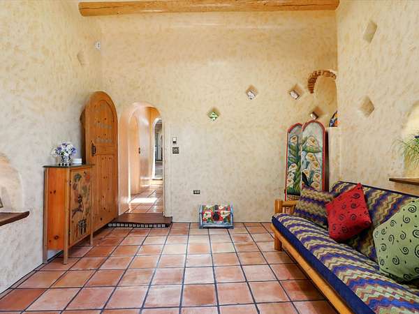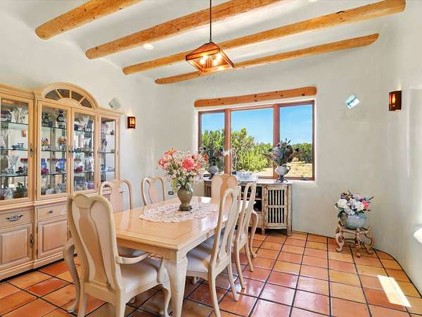 Enchanting Adobe Retreat with Guest Casita on 5 Private Acres - A timeless sanctuary nestled in the foothills of Santa Fe, where every sunrise brings serenity and every sunset invites reflection. For over three decades, this property has been cherished and curated, blending rich Santa Fe tradition with European influences. Begin your mornings on the covered kitchen patio, coffee in hand, as the sun rises over the Sangre De Cristo Mountains. Inside, the heart of the home unfolds with a kitchen island overlooking the living room's doors and windows - framing an ornamental cherry tree and a 300-year-old pinon tree. This custom adobe overflows with craftsmanship. Hand-carved beams, herringbone latillas, corbels, nichos, and structolite plastered walls speak to the region's architectural heritage. Thoughtful design details elevate the space: Venetian glass lighting, custom fixtures crafted by local artisans, and elegant Italian porcelain baths with satin nickel finishes from "Santa Fe by Design." Enjoy year-round comfort thanks to thick adobe walls, Marvin doors and windows, and radiant in-floor heating throughout the home. As the day winds down, indulge in a soak in the luxurious 6-foot clawfoot tub, gazing out the large picture window by sunset. Multiple portals - two attached and two detached - offer peaceful spots to unwind, each with its own perspective of the lush 5-acre grounds. Designed as an equestrian property, the land is both functional and magical, offering serenity, privacy, and space to explore. Included is a charming and fully private custom adobe guest house - perfect for guests or as a proven income-generating rental. 31 A&B Hondo Trail is more than a home; it's a living piece of art, a place of beauty, peace, and purpose. Come experience the enchantment for yourself. MAIN HOME HAS A NEW ROOF INSTALLED MAY 2025