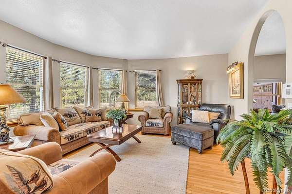 Nestled in the serene beauty of the mountains, this spacious stucco home offers a perfect blend of luxury and natural charm. On 5 wooded acres, this property provides breathtaking Mountain Views that can be enjoyed from multiple vantage points throughout the home. With 3 beautifully appointed bedrooms upstairs and 3 bathrooms, this residence is designed to offer comfort and elegance at every turn. The heart if the home is the gorgeous kitchen with sleek quartz countertops, large island, stainless steel appliances, and walk-in pantry, flowing seamlessly into the dining room. Oak hardwood floors are featured throughout. The media room offers an entertainment center, while the living room showcases mountain views. The upstairs primary suite offers bright windows with views and access to a private deck. A 4-car heated garage includes animal care spaces with covered dog run, wash station & indoor kennels. Above the garage is an additional 800 sq ft living space well suited for a home office or guests. A 20 x 50 RV garage with electric power is also included. Hiking, biking, and hunting await at the nearby State Wildlife Area. Great year round access and adjoining 5 acres also available.