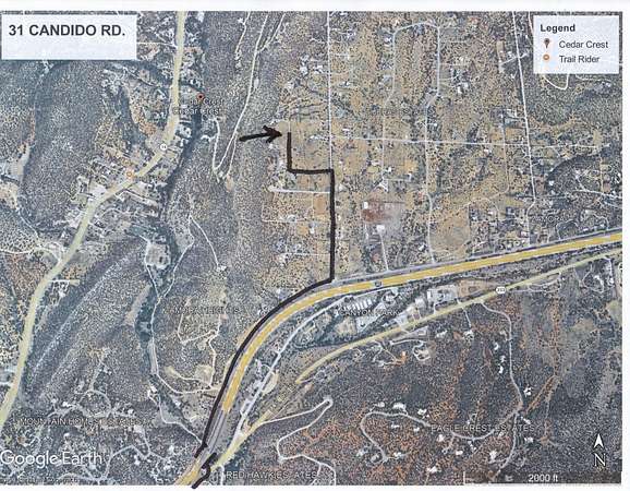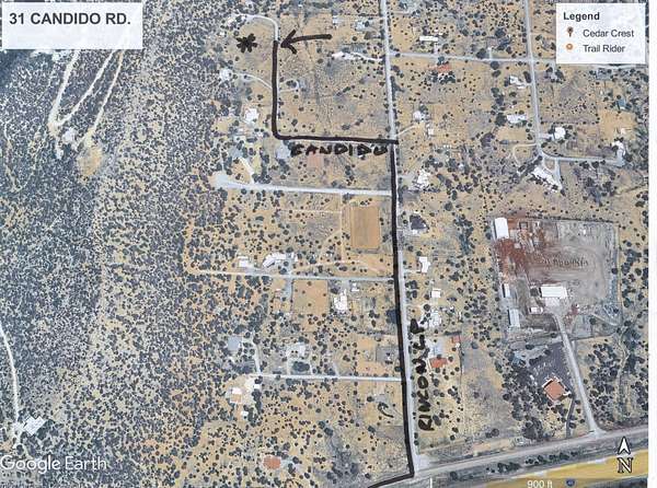 I-40 Tijeras Exit. Continue East (Don't go right to So.337 OR north to N14..Go East on service rd. past Up ramp to EBound I-40 then East to next Left N.Zamora Rd. back N under I-40. Follow East to Left on Rincon. North 4 streets to Cadido Rd. Left West then north to lot on your left. SIGN just before posted gate.See sat pics in photos.
