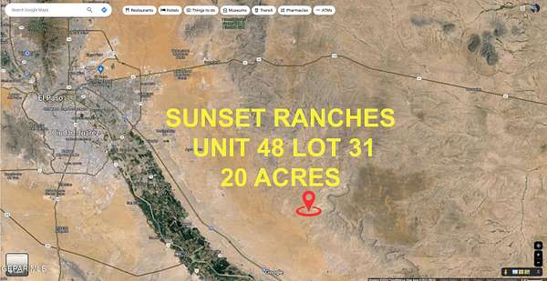 Est $101/moGreat opportunity to own 20 Acres of raw land on West Texas. Great for long term investment, camping, off road, or if you prefer to live away from the city. Lot is off Compadres Ave and almost corner of Karina St. Carina St connects with San Felipe Road. You can access from Fabens and I-10. Just about one hour away from El Paso TX. You can also access from Alcala Rd at Ft Hancock. Don't miss this opportunity Confidential Remarks: There are no utilities on site or nearby.
