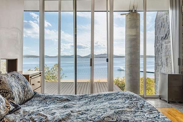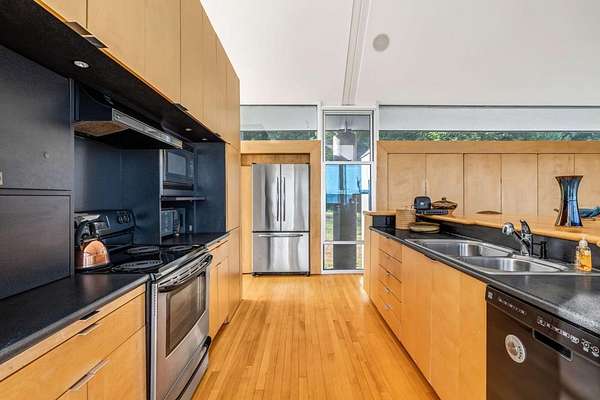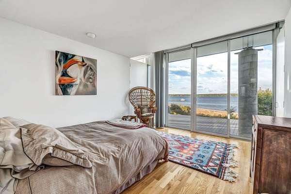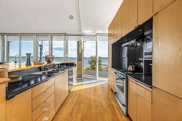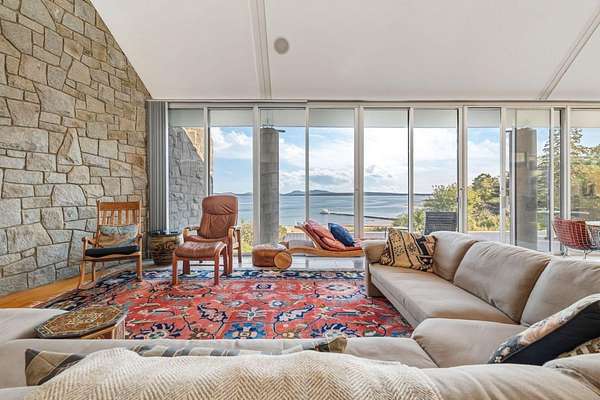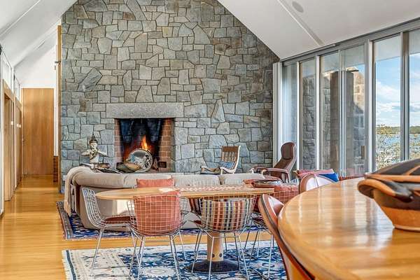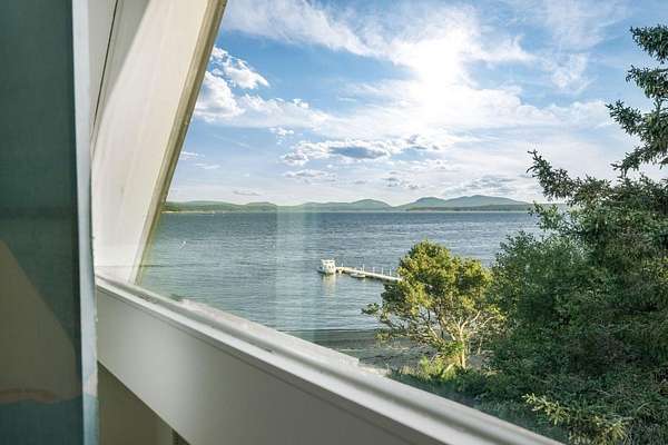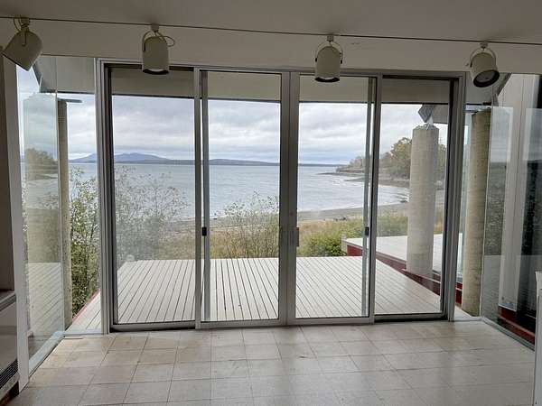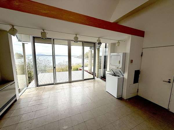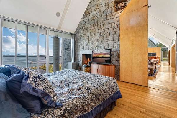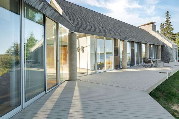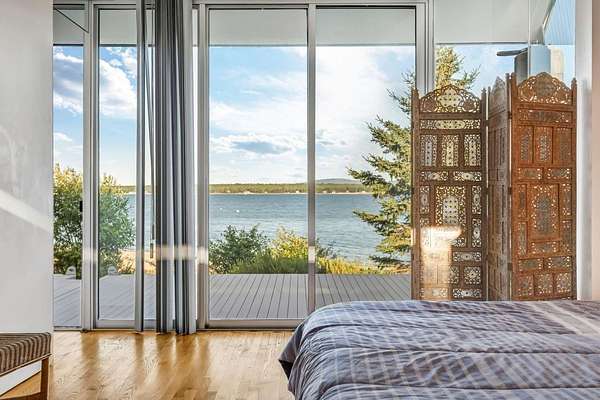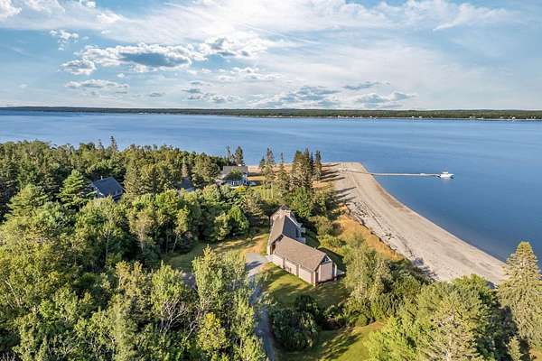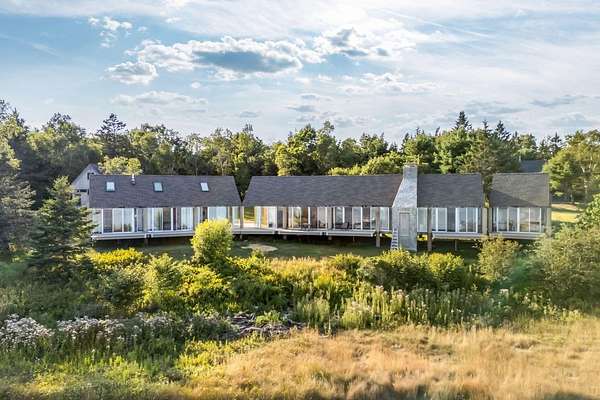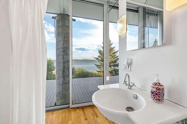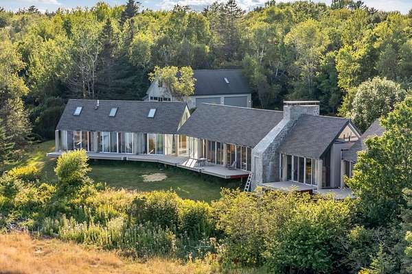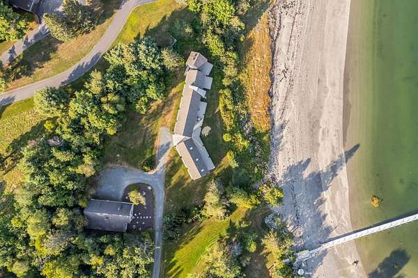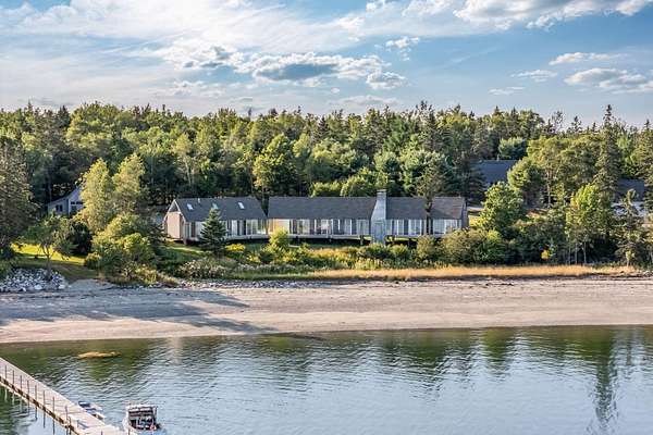 Between the incredible beach setting, the architecture, light filled rooms and style of this Peter Forbes designed masterpiece, you'll enjoy all this property has with plenty of room for your extended family and guests. The purpose in the design was to wrap the beautiful gravel beach shoreline with the curve of the house and to keep it simple with uncluttered spaces with extensive storage space in the unique 'saddlebag' style closets hanging off the back and to be able to display their art along with having an art studio off the north end. With spectacular views of Union River Bay to the mountains of Acadia the home was built on concrete pillars that go all the way to the roofline to support the unique steel and wood structure and the decks even fold up in the winter to become storm shutters for the wall of glass on the water side. The main house is basically one bedroom and the guest house. that is just a few feet apart on the deck, includes another three bedrooms down and two more in the loft. The detached garage has an office and finished shop area that could be more living space or an additional upstairs in that building that is also finished.