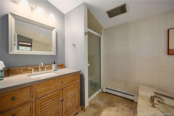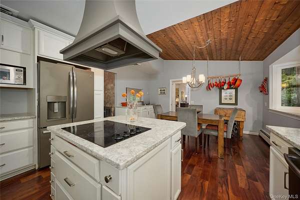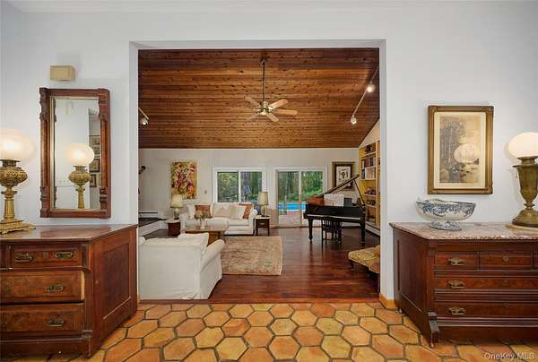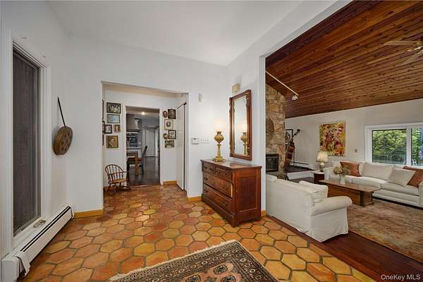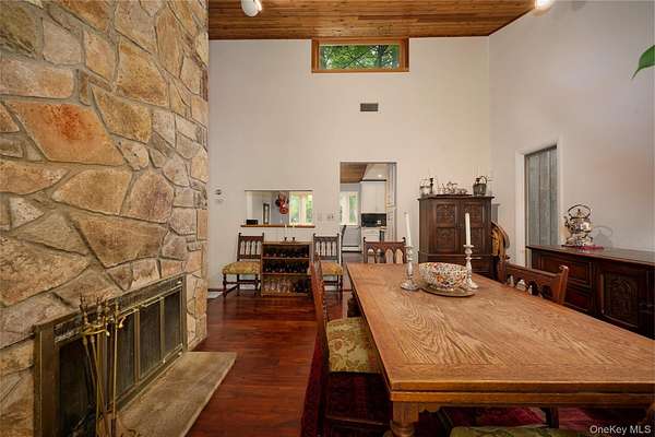 Chic Contemporary MCM retreat with Country Charm Welcome to this light-filled 4-bedroom, 3.5-bath contemporary home nestled on 2.44 private, park-like setting. Designed with style and comfort in mind, this distinctive residence offers a rare blend of MCM architectural character, modern updates and rustic warmth. Step inside to soaring knotty pine cathedral ceilings, gleaming floors, and terracotta tile accents-hallmarks of mid-century modern design that celebrates natural materials and volume. A stunning double-sided fireplace anchors the step-down living room and elegant dining room, creating warmth and ambiance from both spaces. The updated kitchen features quality finishes and generous space for cooking and gathering, flowing directly onto a large deck with charming flower boxes- perfect for dining or relaxing while overlooking the inground heated pool. Enjoy seamless indoor-outdoor living, a defining element of mid-century modern design, with direct access from the main level to the beautifully landscaped backyard and pool area, creating a very private retreat ideal for entertaining or peaceful escape. The home offers a well-designed and versatile layout: o Main Level: Entry terracotta foyer, step-down living room with double-sided fireplace, dining room, powder room, updated kitchen, mudroom pantry-area and access to a 2-car attached garage. o Upper Level: Private primary suite with in-suite bath, two additional bedrooms, and a full hall bath. o Lower Level: Fully finished with a spacious family room, bedroom, and full bath-- ideal for guests, a home office, gym, or au-pair suite. Additional highlights include a whole house generator, abundant natural light, multiple skylights, and mature trees that offer beauty and privacy in all seasons, Live the lifestyle of your dreams-- come home to vacation every day in this stylish, serene, and beautiful home.