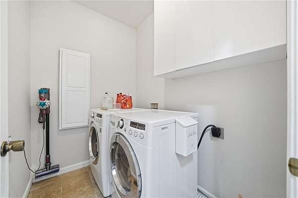 The main-level owner's suite is oversized with a sitting area, double vanity, soaking tub, separate shower, private water closet, and dual walk-in closets. Two additional bedrooms share a large full bath conveniently located near the laundry room, complete with storage cabinets and a built-in ironing board.