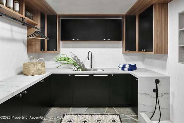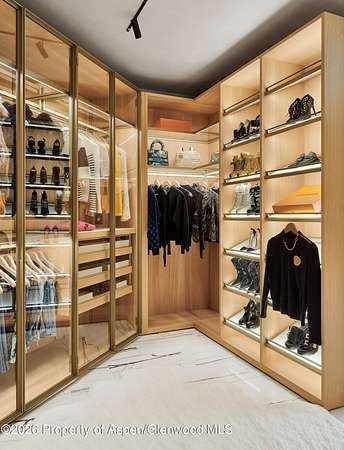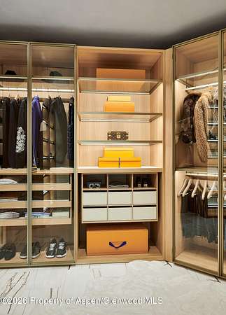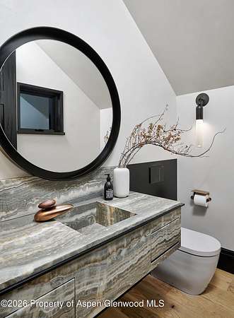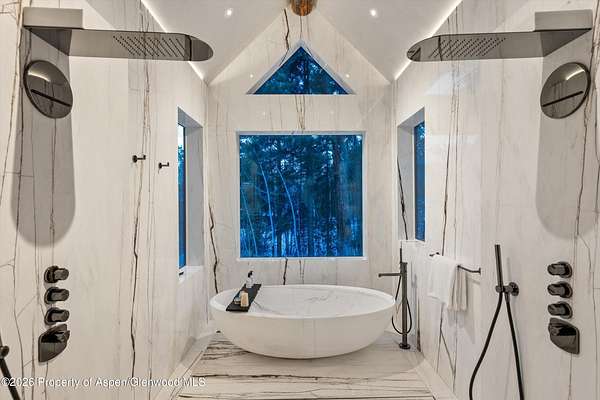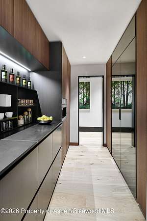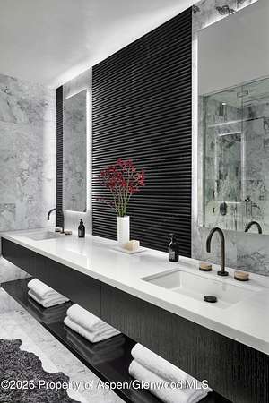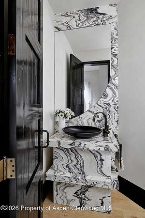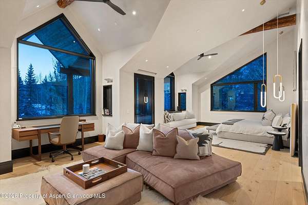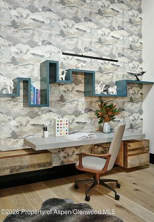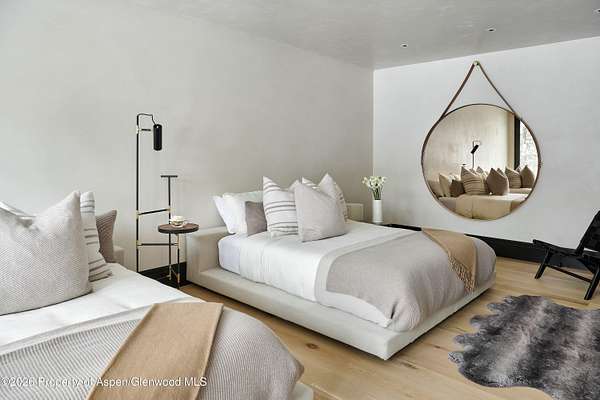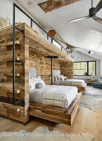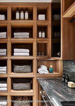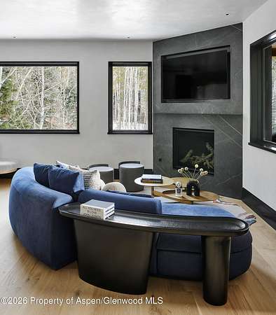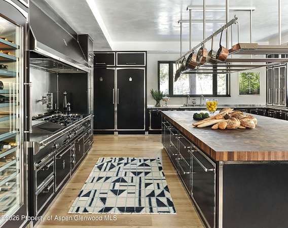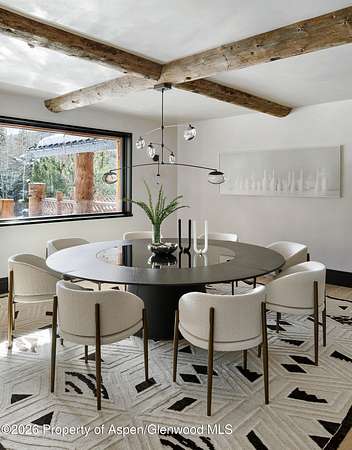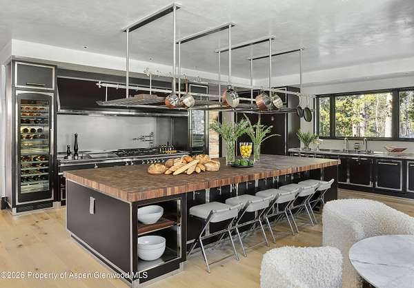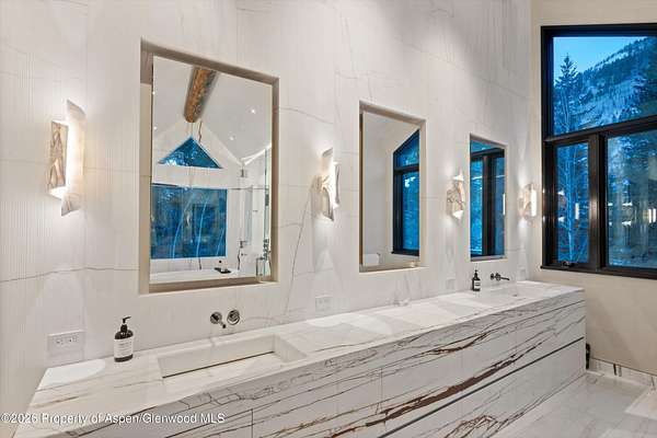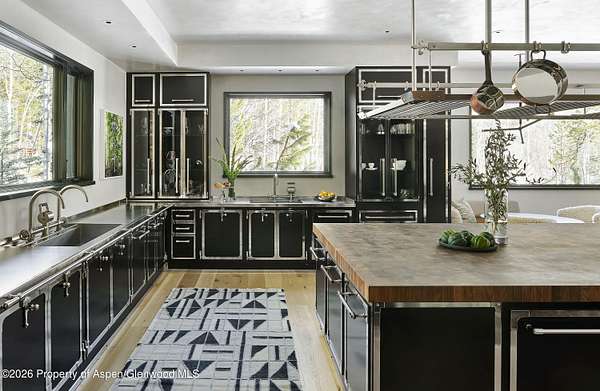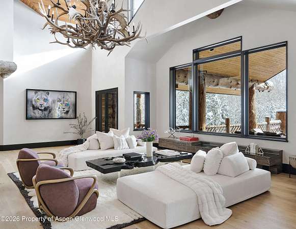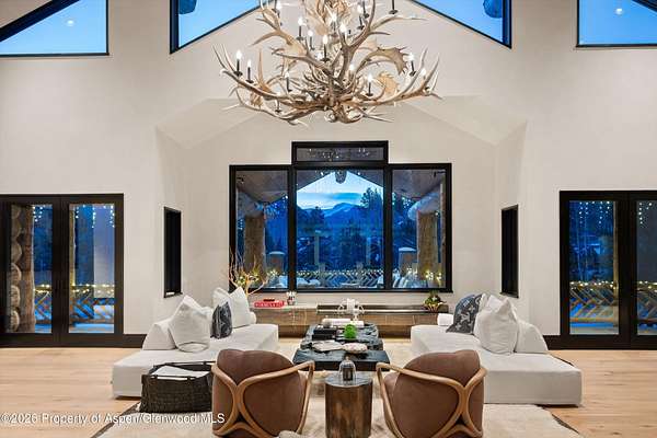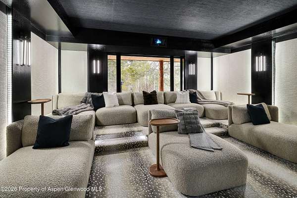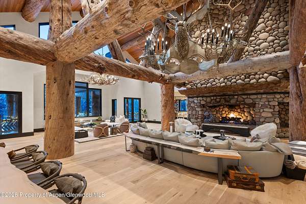 31 Northstar Circle is honored as Mountain Living's 2024 Home of the Year, a rare Aspen estate defined by scale, privacy, and architectural integrity, thoughtfully reimagined for modern living. Set on two private acres between Stillwater and Northstar Preserve, the property offers true seclusion just minutes from downtown Aspen. Originally designed by Lee Pardee and constructed with reclaimed logs salvaged from the historic Yellowstone fires, the residence underwent a comprehensive, nearly three-year renovation completed in 2023 by Jason Gleasman Construction. The result is a classic Western mountain home redefined by renowned designer Helena Flecker, introducing a lighter, contemporary interior while honoring the home's original character. Venetian plaster walls, bleached white oak floors, refreshed original timbers, and custom furnishings sourced from Milan create a warm, refined atmosphere throughout. All-new energy-efficient windows with slim black frames bring in abundant natural light and frame forest and mountain views. The main level is anchored by a dramatic great room featuring an oversized open-flame river-rock fireplace, formal dining for ten, and a striking Officine Gullo Firenze kitchen with Gaggenau appliances. A monumental butcher-block island (approximately 10' x 25'), oversized wine room, half-log bar, and a fully equipped butler's pantry with custom cabinetry and a Miele espresso station support both entertaining and everyday living. Two powder rooms complete the level. Designed for year-round enjoyment, the home includes an acoustically engineered, soundproofed theater by Autograph Home Entertainment with flexible stadium seating and spillover guest capability. An adjacent den features a Giorgio Glass and leather foosball table and rattan walnut library shelving by Baxter. The residence is fully integrated with Sonos whole-house audio, Savant control, dual staircases, and an elevator servicing all three levels. Outdoor living is expansive and private. A wraparound covered porch offers two distinct dining experiences: a monumental stone table seating twelve or more with exterior-grade leather and wood chairs, and a more intimate round dining area with leather lounge seating for six to eight. Additional seating areas capture views in all directions, alongside a sheltered Barcelona ping-pong table. On the south end of the home, a large hot tub accommodating ten comfortably with a mechanical cover sits adjacent to an outdoor lounge and gas fire pit. A BBQ patio with an EGG cooking oven connects directly to the kitchen. On the north side, a stocked and aerated pond, suitable for pond hockey, is framed by a stone patio, yoga deck, and seating area, with a private nature trail and landscaped grounds by Escape Garden Designs, including a hidden garden shed integrated into the landscape. The bedroom layout is ideal for both family and guests. A main-level VIP suite features a walk-in closet and spa-style wet room. Upstairs, the primary suite includes a gas fireplace, private office, hidden standing safe, and breakfast bar, along with two custom walk-in closets featuring automatic lighting, leather-lined drawers, and tailored storage, handcrafted in Carimate, Como, Italy by Porro. The primary bath includes marble dual vanities, an infrared sauna, a soaking tub, and a double shower wet room. A covered terrace captures sunrise views of Sunshine Peak and the Continental Divide. Also on the upper level is an en-suite guest bedroom with custom wallpaper incorporating a subtle 14K gold leaf motif inspired by falling foliage. A signature bunk room with queen beds, dual walk-in closets, a fire pole, full bath, walk-out terrace, and adjacent laundry complete the level. A porte-cochere arrival, radiant in-floor heating, central air conditioning, a new standing-seam metal roof, a full fire-suppression system, and turn-key furnishings (excluding artwork and personal effects) complete the offering.