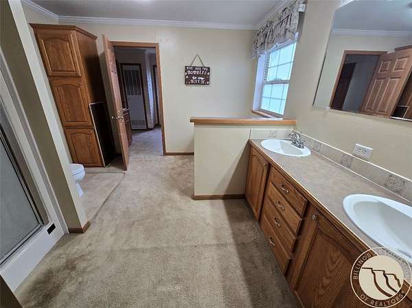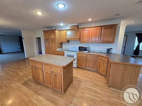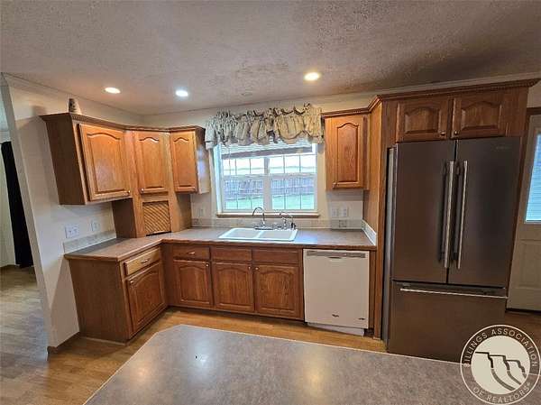A 4 bedroom 2 bath home sitting on 14 Acres with a detached oversized shop. This home is full of potential with everything on 1 floor and located just outside of Baker. The home has a large kitchen with and island that gives lots of counter space and makes the kitchen very functional, off of the kitchen is a door to the partial fenced in backyard with a cement patio. There is a family room, living room, and dining room all open to the kitchen as well. The primary bedroom features an attached bathroom with a garden tub and walk in shower and a walk in closet. This is accessible through the laundry room area which has a utility sink. The other side of the home has 3 large bedrooms and a full bath. Outside is a large shop that is set up for a small heated room and bathroom. There is a horse lean to structure, perimeter fencing all overlooking a small run off creek through the property.