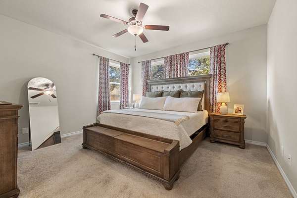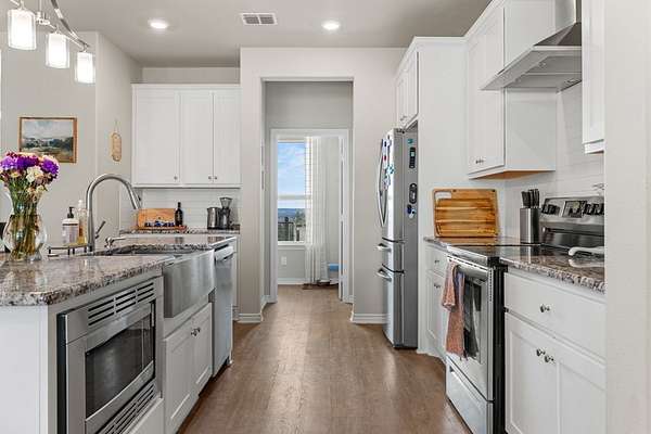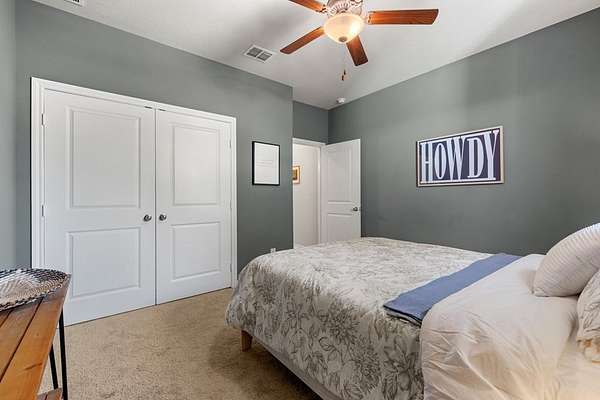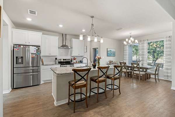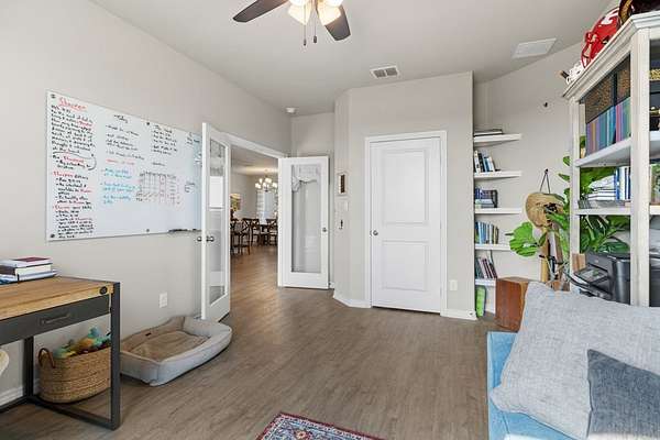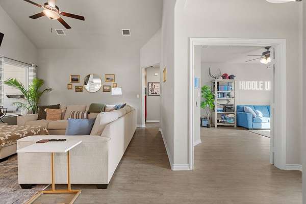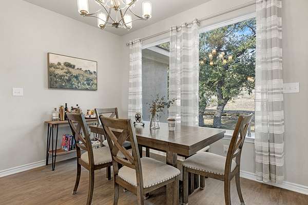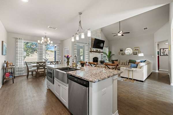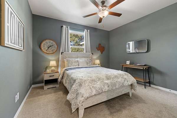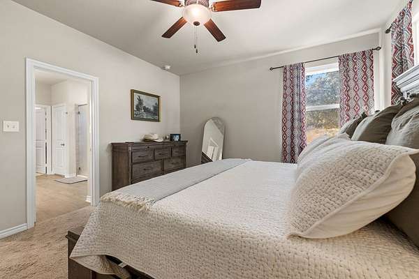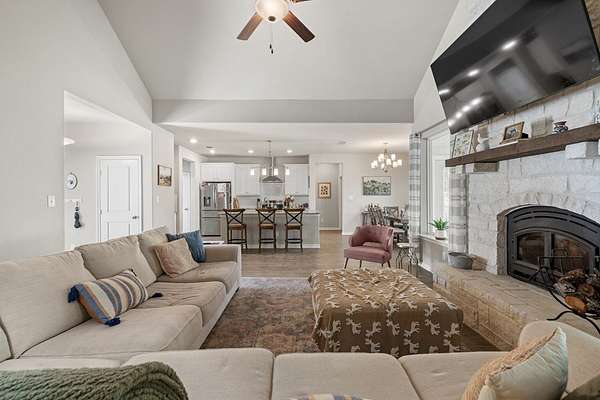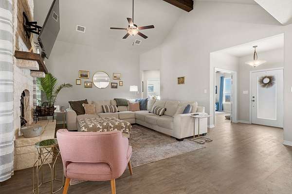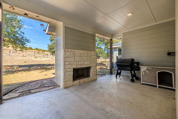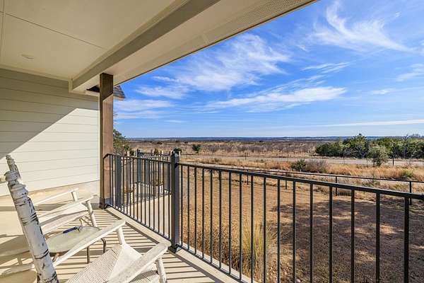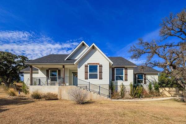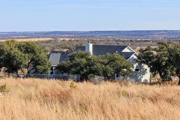 Hill Country living just minutes from town! Situated on 4.26 scenic acres less than 6 miles from Fredericksburg, this well-maintained 4 bedroom, 2 bath home offers privacy, views, and functional space both inside and out. Save on taxes with an ag exemption without having to manage animals - its included with the Homeowners Association. Positioned to capture long-range Hill Country views, the home sits elevated above the surrounding terrain, providing beautiful skies and peaceful sunsets. Mature oaks and native landscape frame the property, while a fenced yard area offers flexibility for pets or gardening. The open-concept living, kitchen, and dining area is bright and inviting with granite countertops, stainless steel appliances, white cabinetry, and a center island with bar seating. Large windows in the dining area bring in natural light and showcase the surrounding views. The split-bedroom floor plan provides privacy for the primary suite, while two additional bedrooms share a full bath. A bonus room/office offers flexible space for working from home, hobbies, or additional guest accommodations. The attached garage includes an additional storage bay with its own overhead door, ideal for a mower, golf cart, workshop space, or recreational/game room setup. Enjoy the best of both worlds: peaceful acreage living with the convenience of Fredericksburg's shopping, dining, wineries, and medical facilities just minutes away.